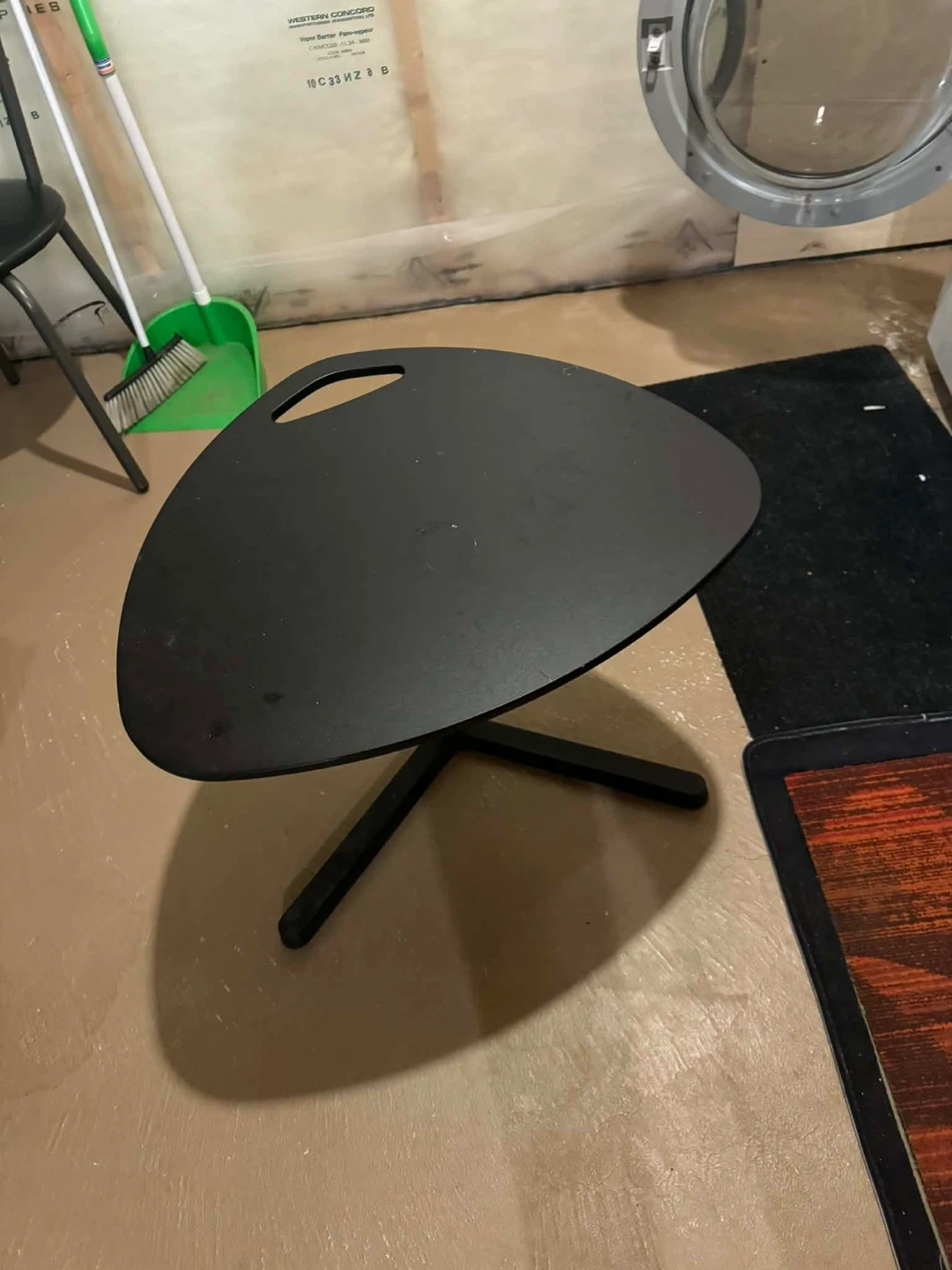 This adjustable black laptop table is perfect for use anywhere. It has a sturdy tripod base and a rotating, adjustable top. Its sleek design makes it a versatile addition to any space.