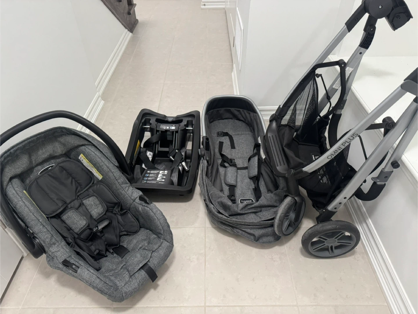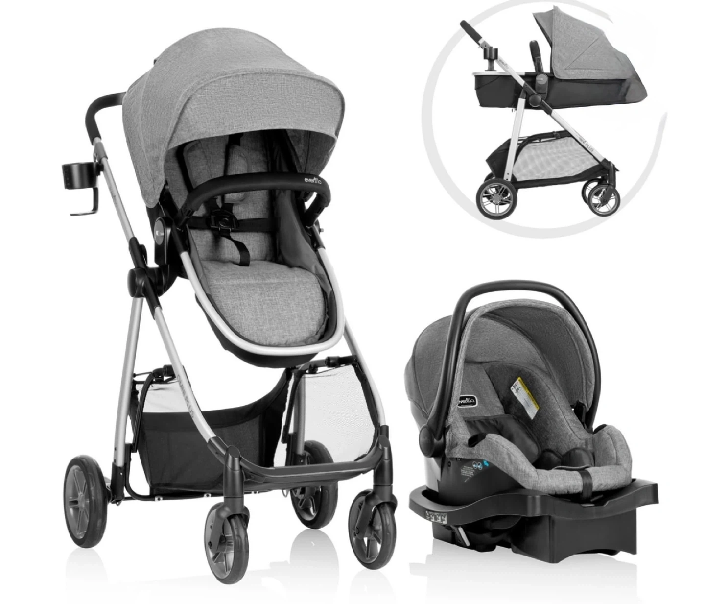 This Evenflo Pivot Travel System comes with an infant car seat and stroller. It's a grey, textured fabric. The stroller has a modular frame that can face forward or backward. This system's great for getting around with a little one!