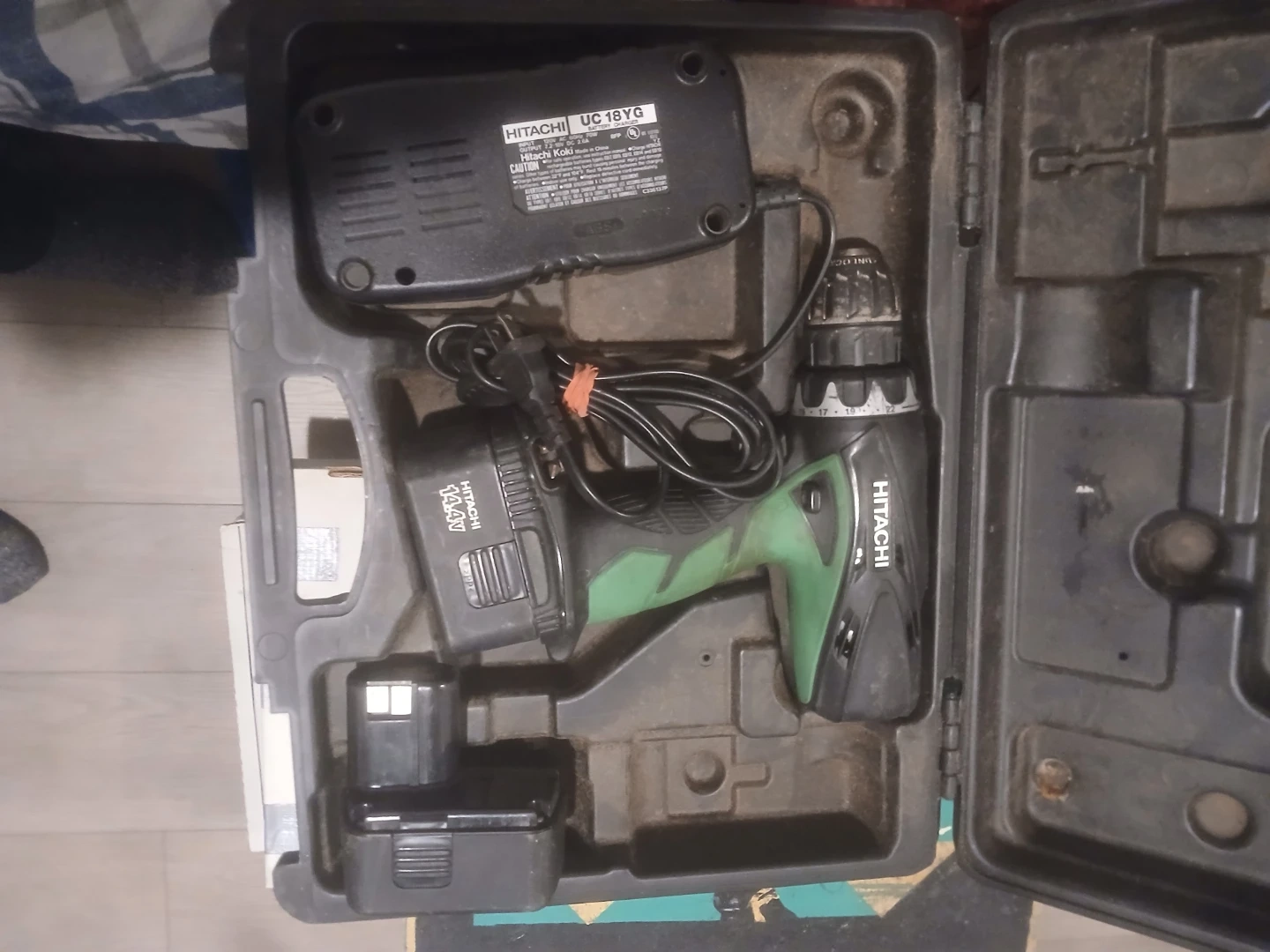 This is a Hitachi 18V cordless drill set, including a charger and one battery. It's housed in a black and green carrying case. The charger model is UC18YG.