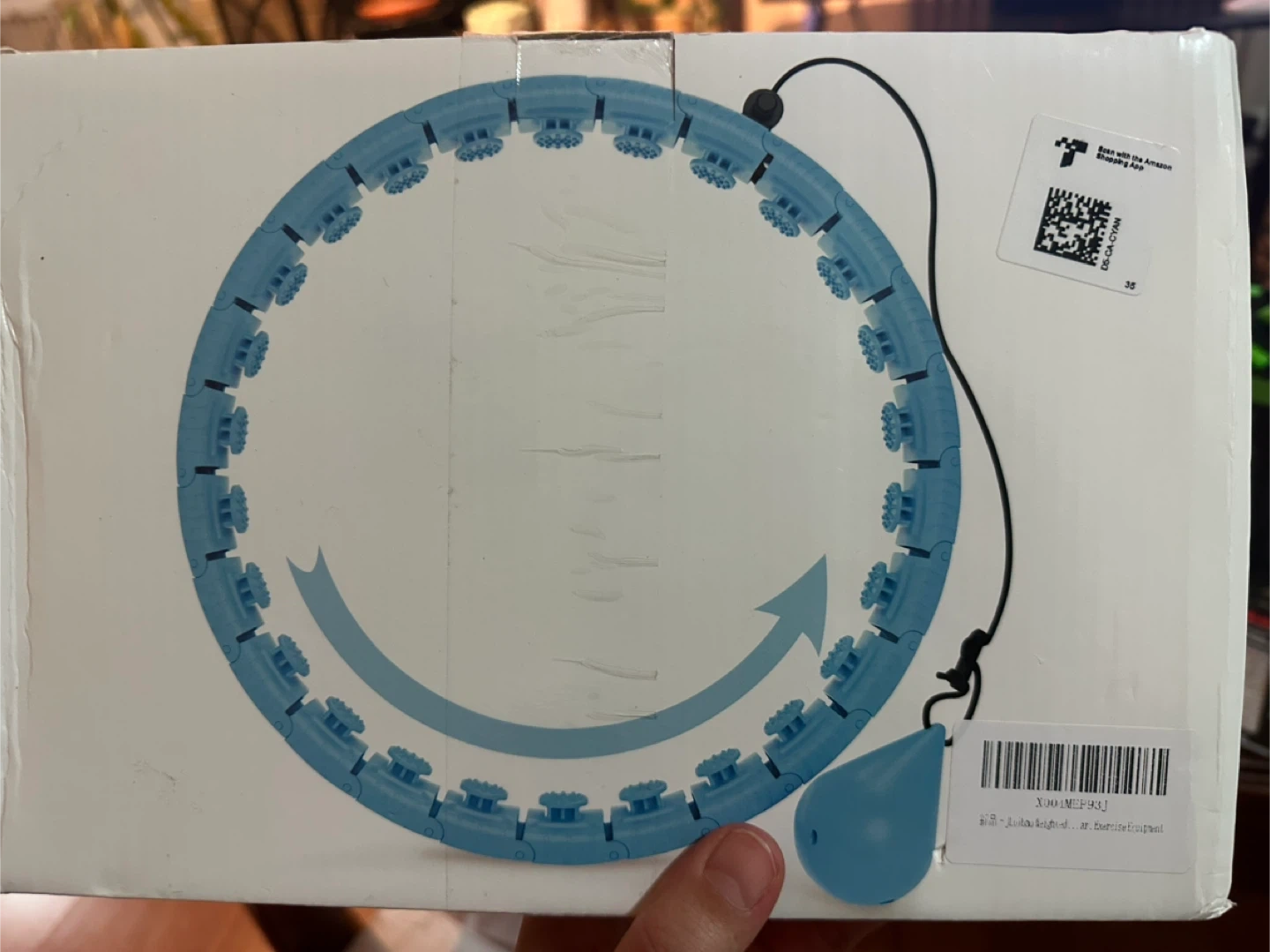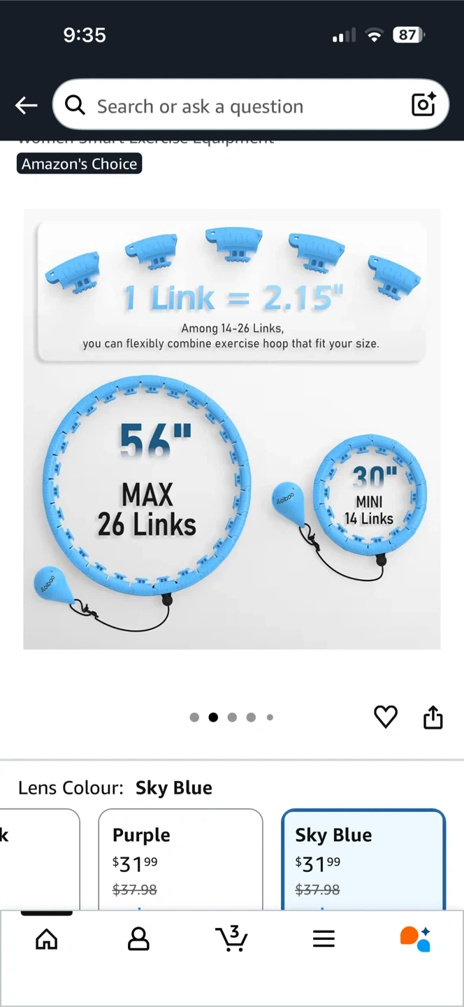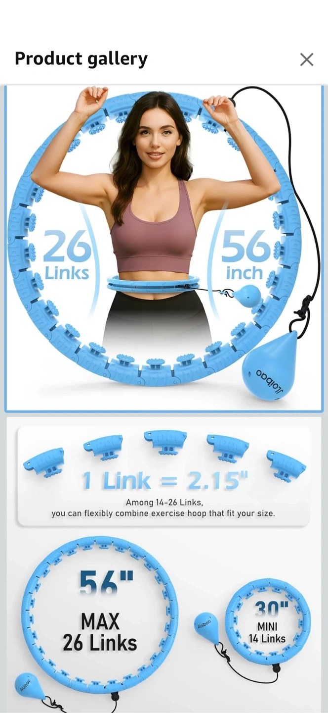 This exercise hoop features 26 detachable links, allowing you to customize its size. It has a maximum diameter of 56 inches. The weighted ball and adjustable design make it suitable for fitness routines.