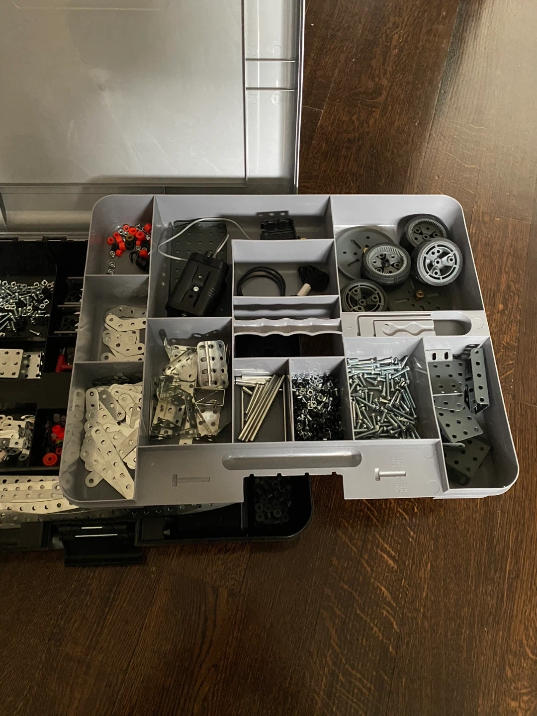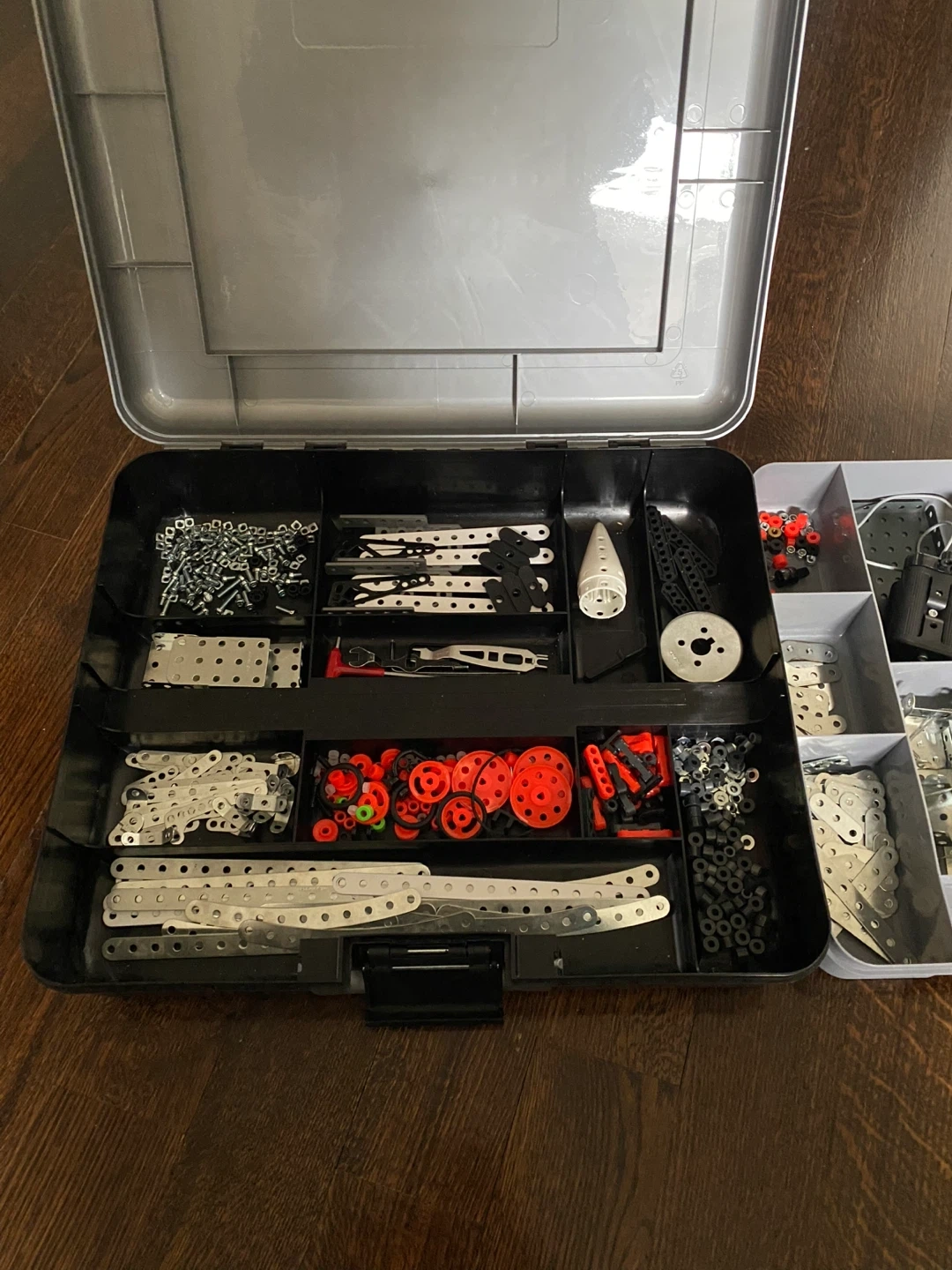 This is a Meccano Super Construction Set with a storage case. It includes various metal pieces, gears, and fasteners for building. Instructions are included for a crane model.