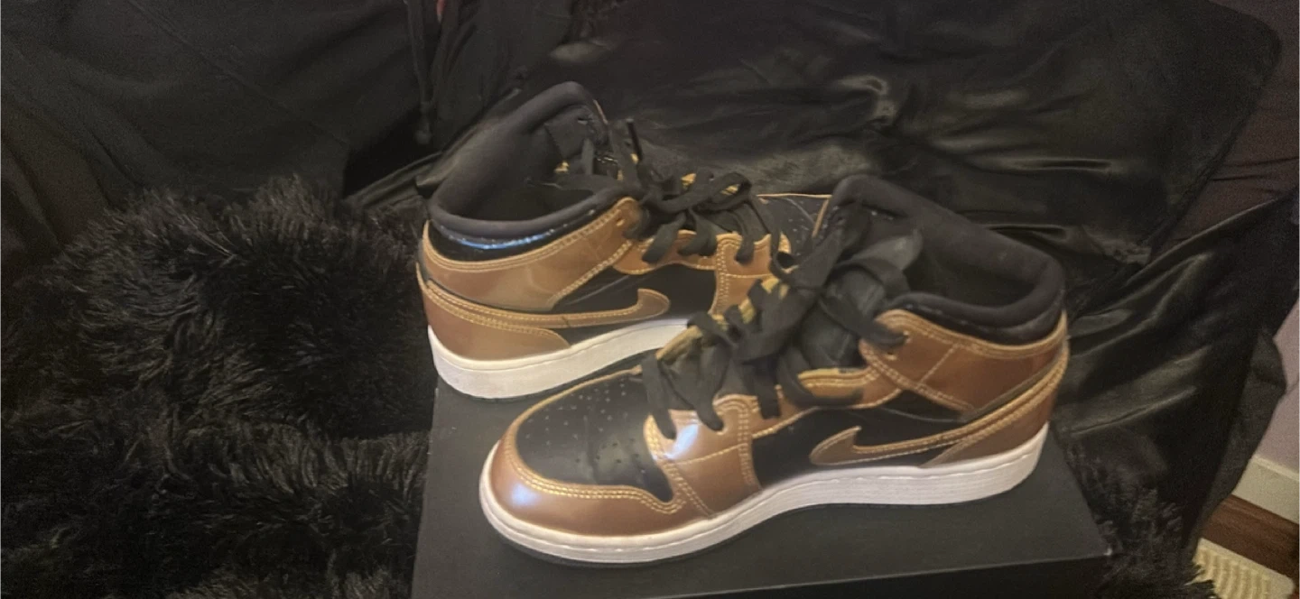 These Air Jordan 1 Mid sneakers come in a striking gold and black colourway. They're a mid-top design with lace-up closure. Includes original box.