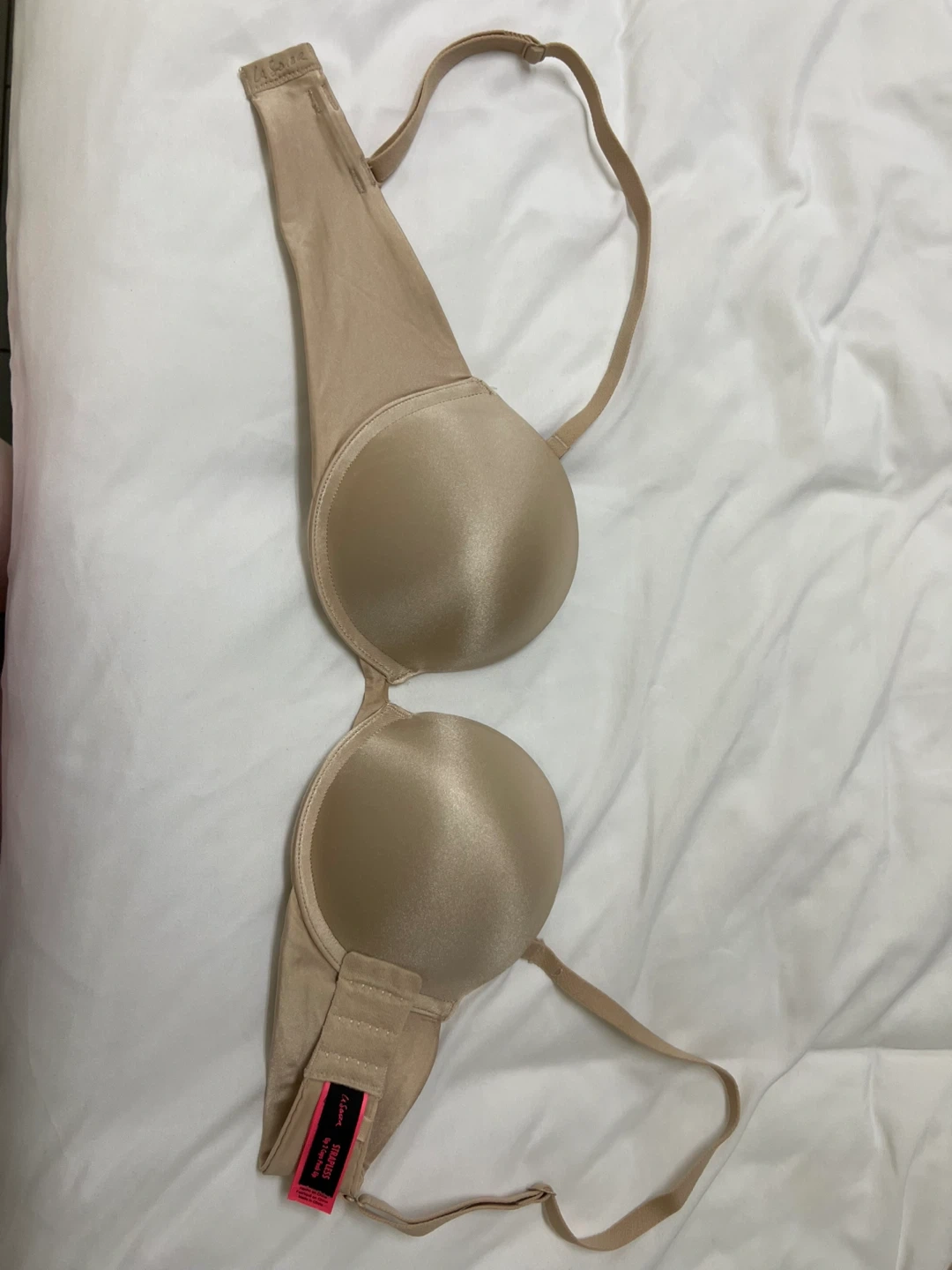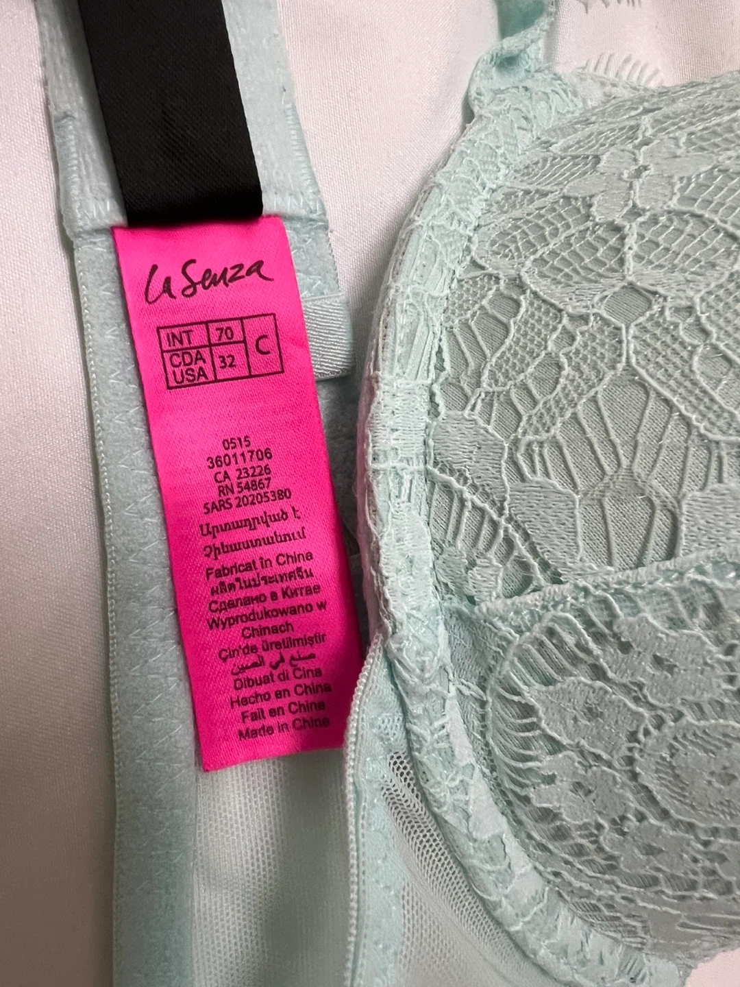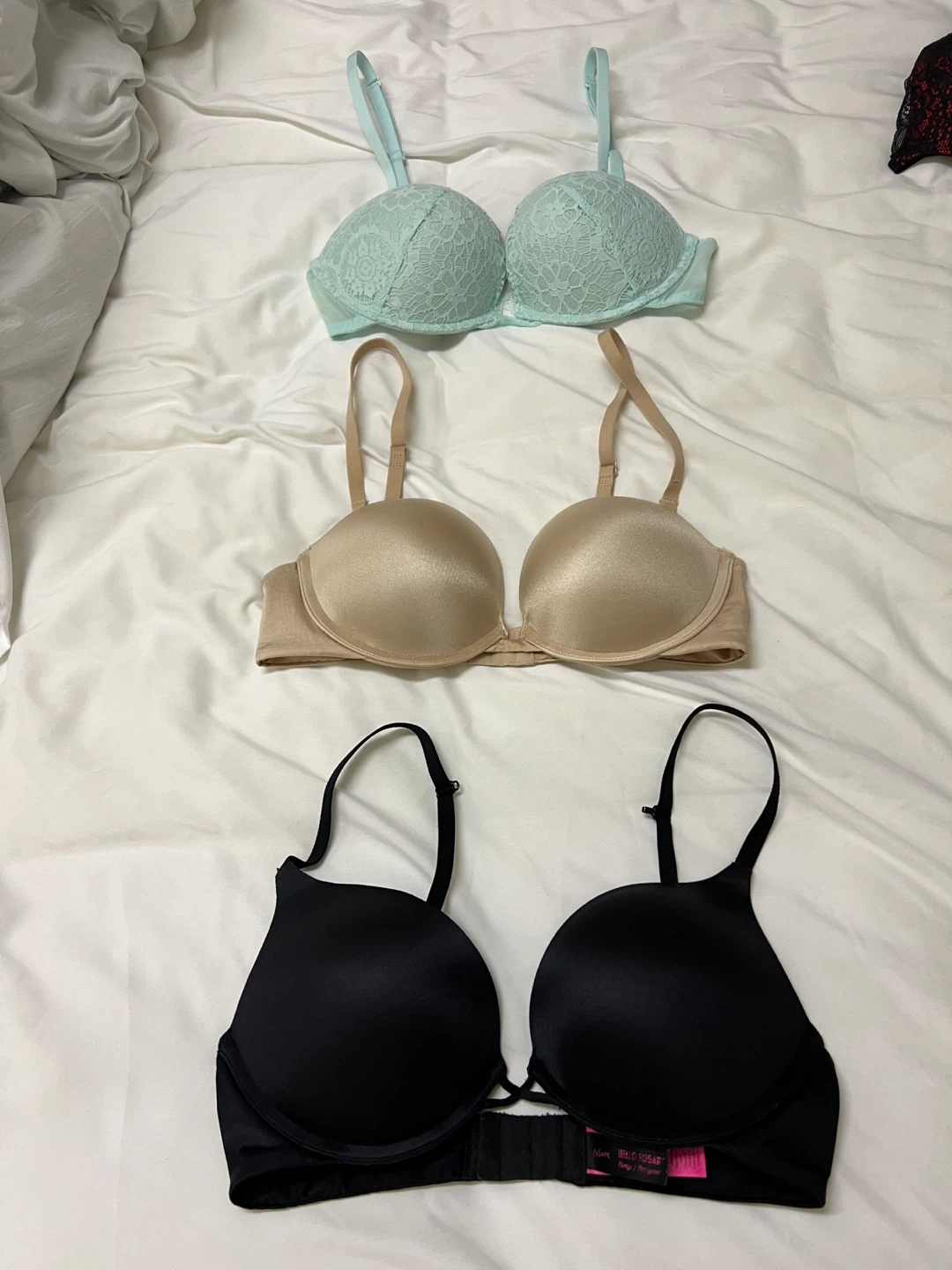 3 double push-up bras from La Senza. All sized 32C with adjustable straps and a hook-and-eye closure. Featuring a black seamless bra and a strapless nude bra that offers a smooth and supportive fit under strapless dresses. The third bra is a nice light teal lace bra. All bras are in excellent condition.