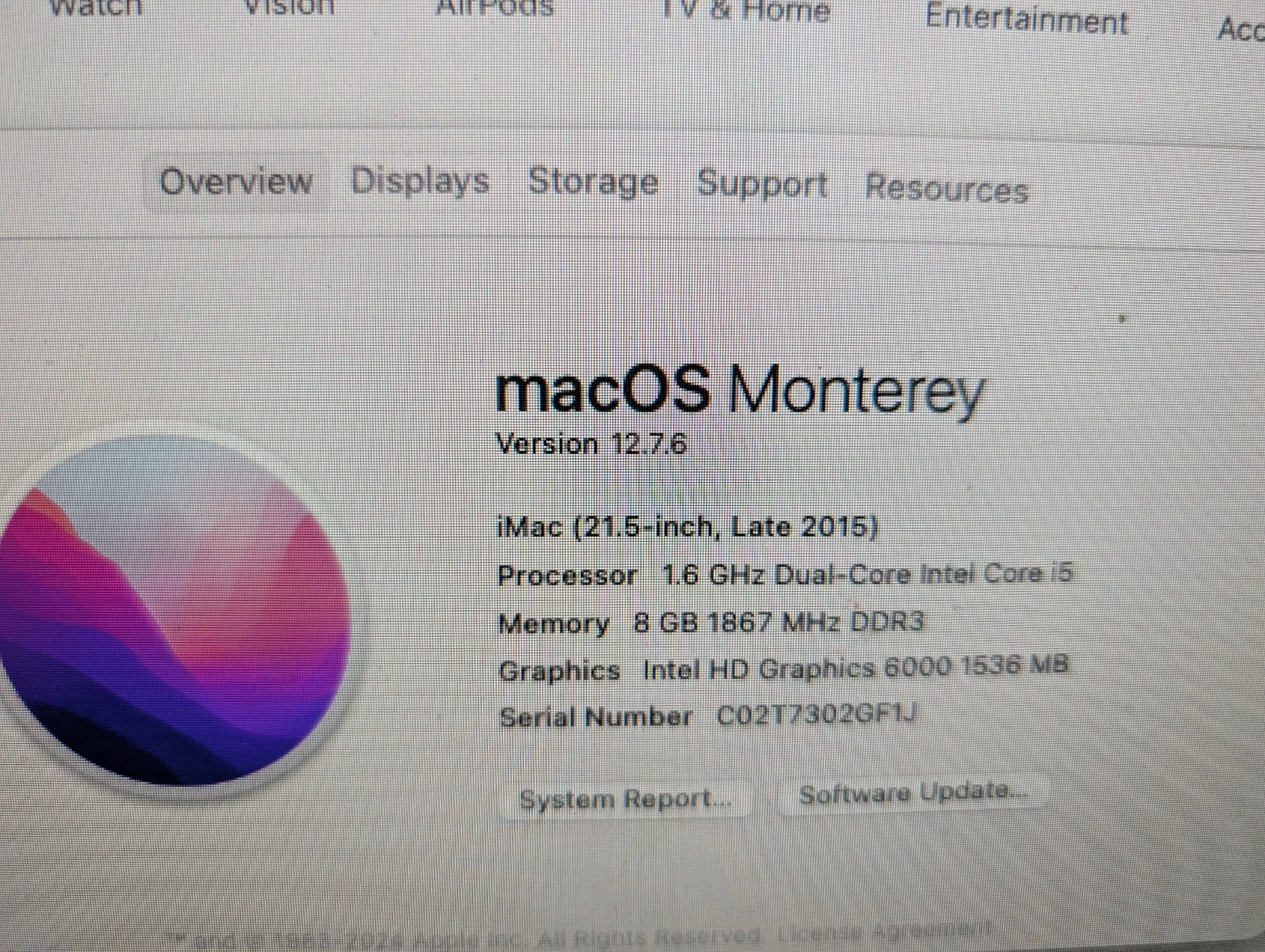 10Selling an iMac (21.5-inch, Late 2015) running macOS Monterey 12.7.6. It has a 1.6 GHz Dual-Core Intel Core i5 processor, 8 GB 1867 MHz DDR3 memory, and Intel HD Graphics 6000 1536 MB graphics Wireless Apple keyboard and mouse included.