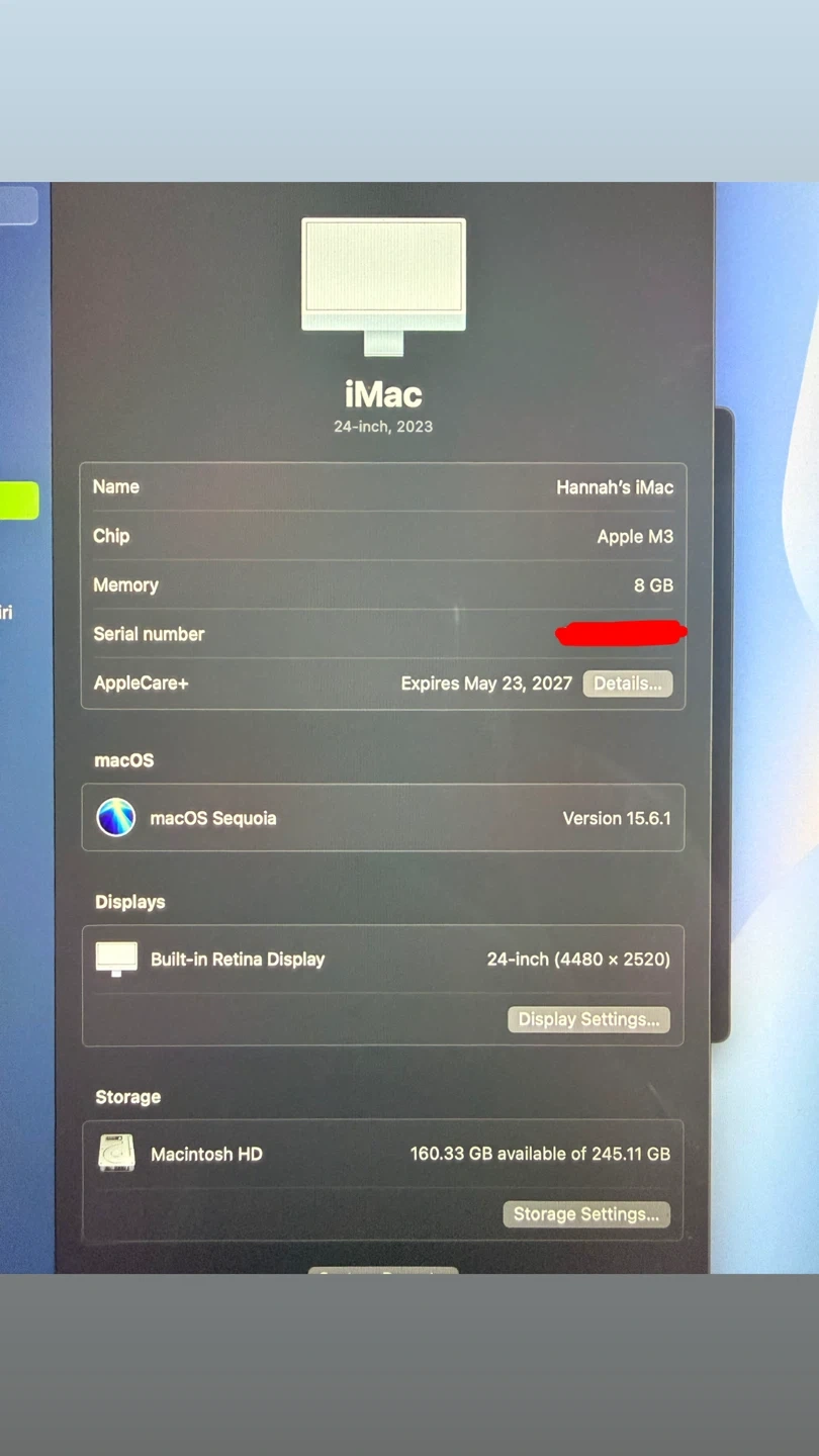 74Selling an iMac 24-inch from 2023. It's equipped with an Apple M3 chip and 8GB of memory. The display is a built-in 24-inch Retina display (4480 x 2520). It has 160.33 GB available of 245.11 GB. AppleCare+ expires May 2027 Overall, it’s in great condition works completely fine. I was using it for school, but decided to upgrade to a laptop. In the third picture, only issue is there’s residue of the glue from the Sunny Angel that was on it
