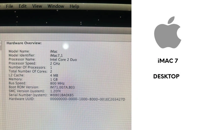 65I have an iMac 7 for sale. I bought it in 2008 and hardly used it. It's almost new in condition. I'm offering it for $330, which includes the deduction of no box and a $29 update required. Computer details are in the picture. 1 Intel Core 2 Duo 2 GHz 1GB memory 4MB L2 Cache 10.6.8. Cash accepted.