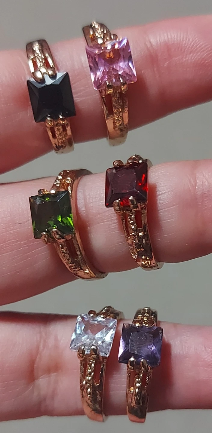 A set of six rings, each featuring a gold tone band with a square-cut gemstone. The colours include black, pink, green, red, clear, and purple. These rings offer a pop of colour and sparkle.