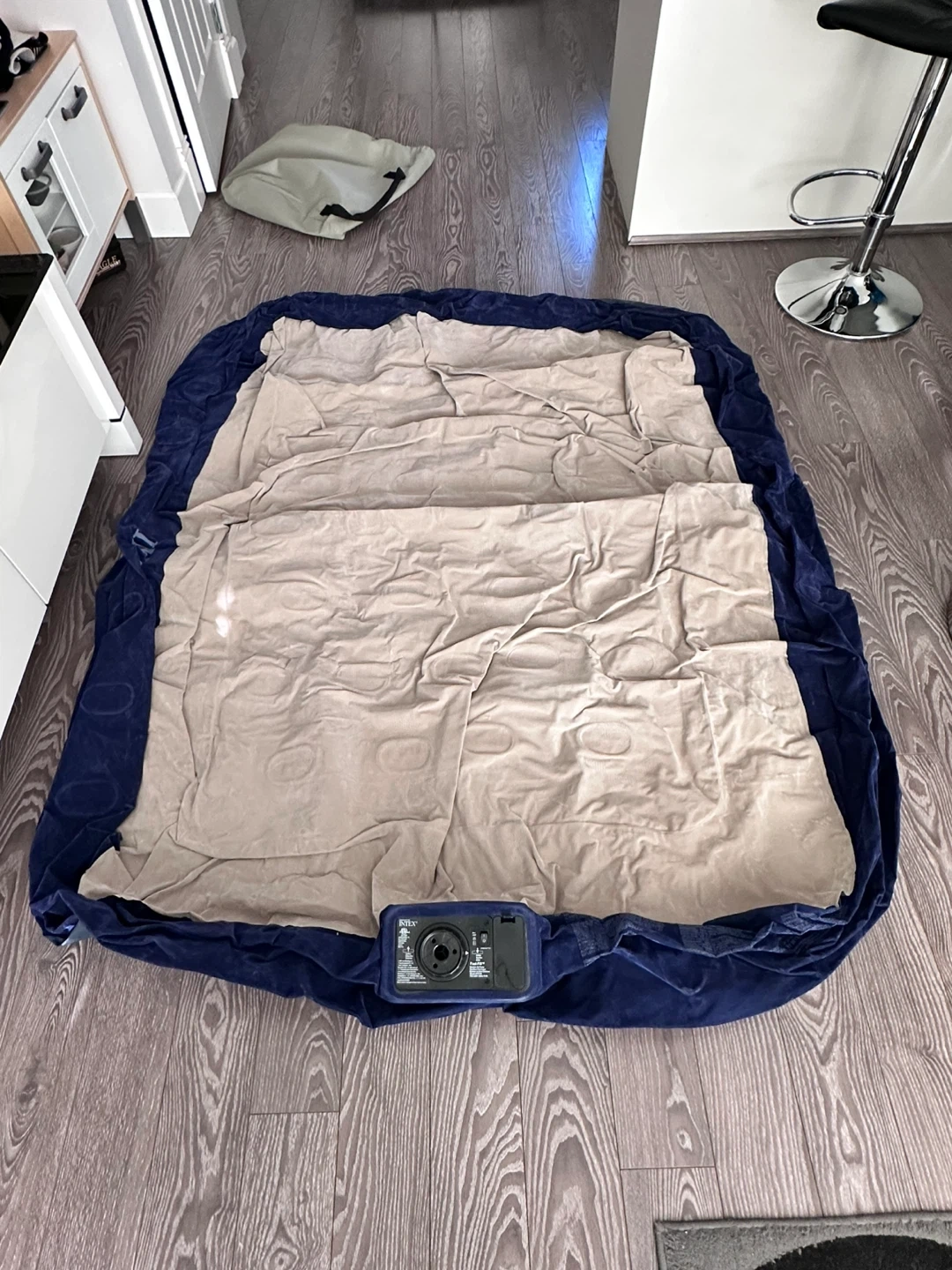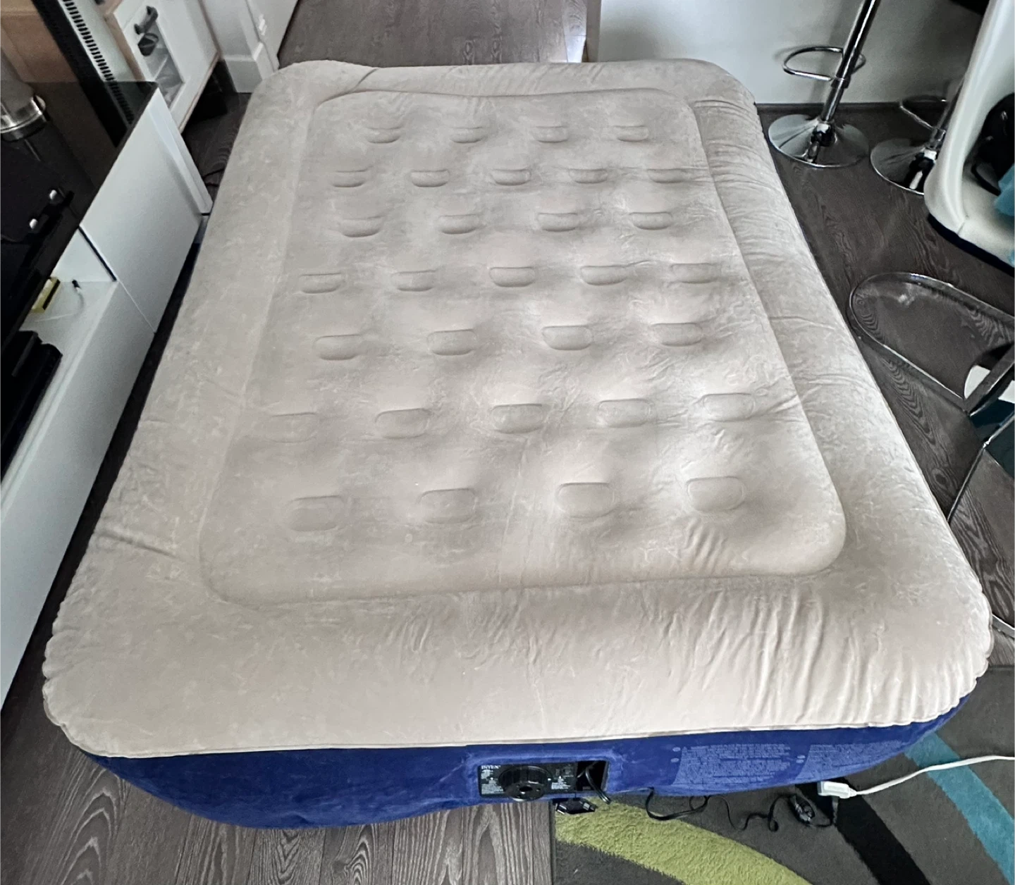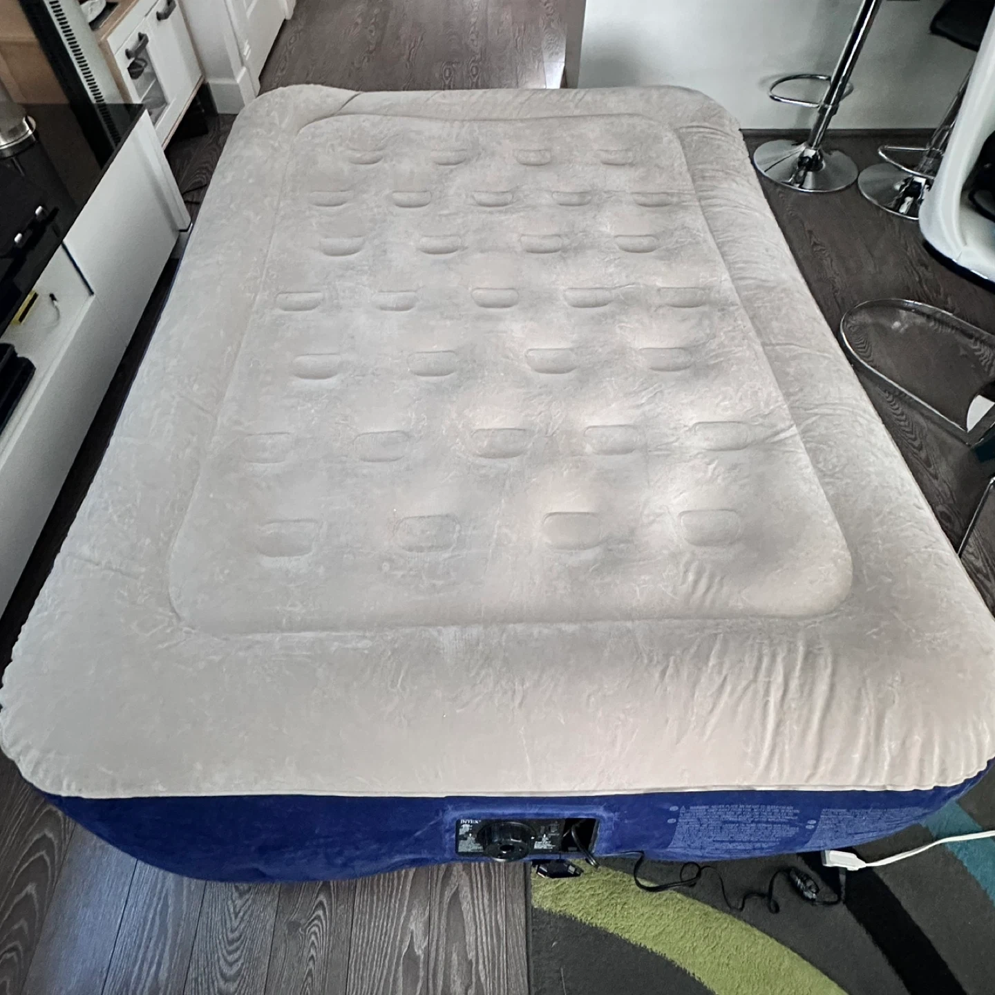 Double sized air mattress from INTEX. Features an integrated Fast-Fill electric pump for easy inflation and deflation. Constructed with durable materials for comfort. Includes the pump and power cord.