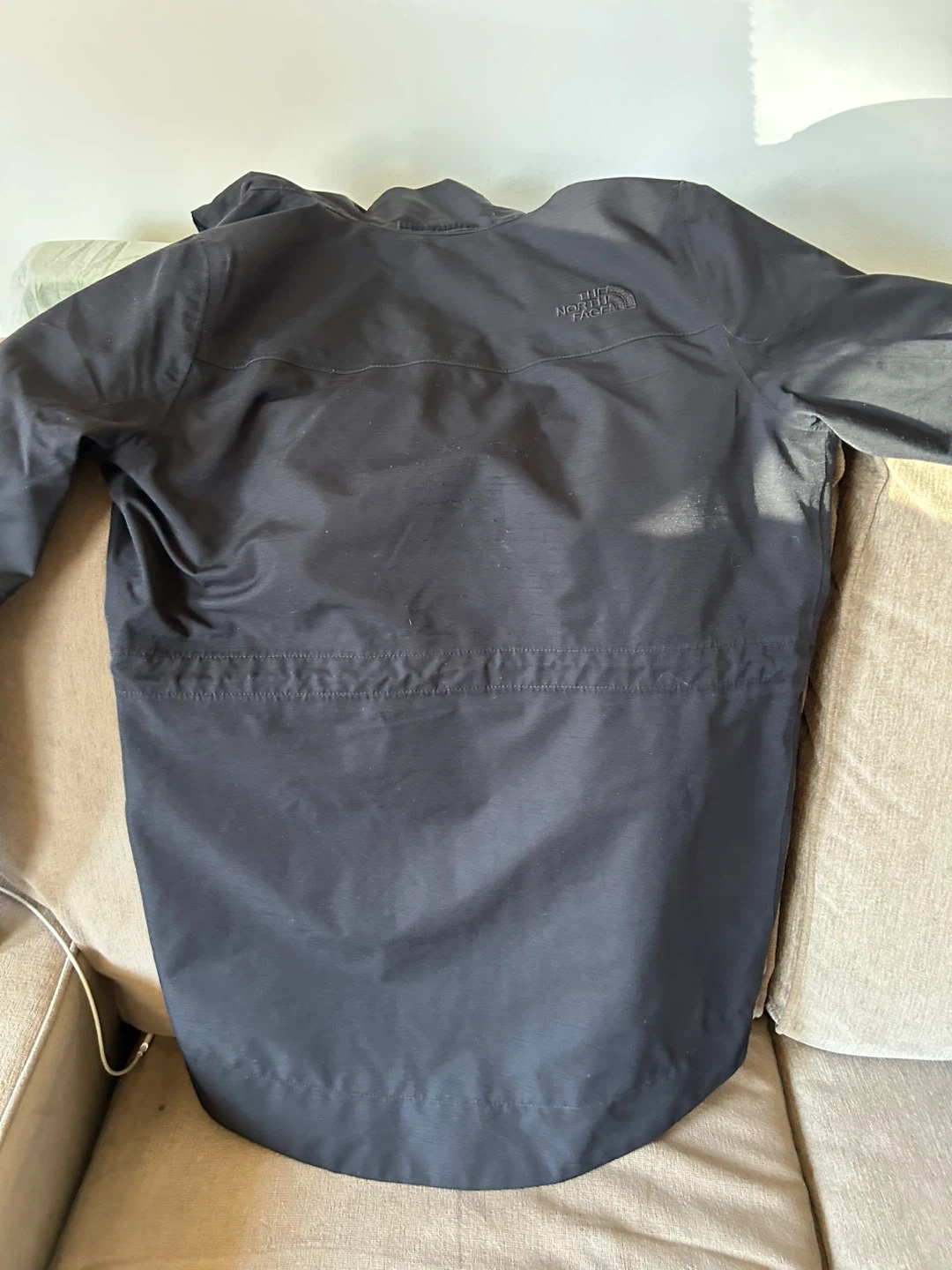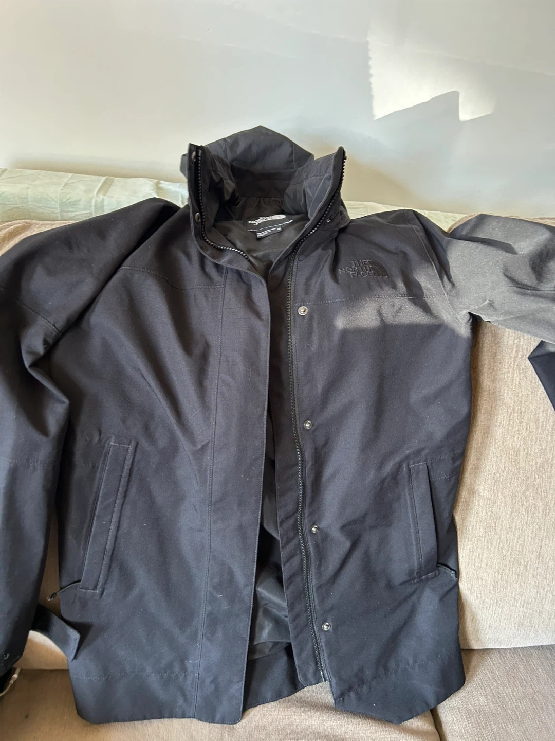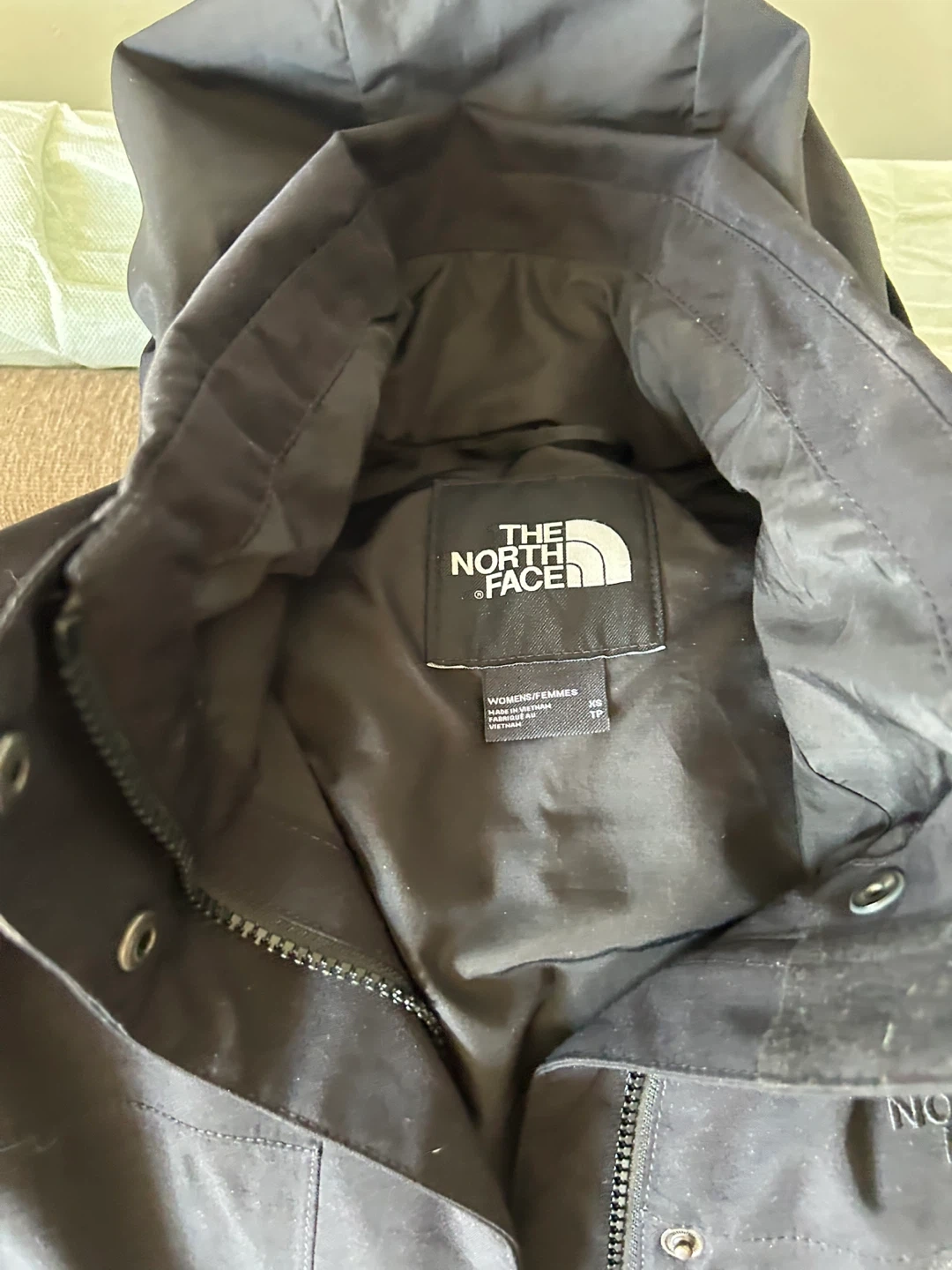 This black The North Face jacket is a women's XS size. It's a versatile outerwear piece. It's great for staying protected from the elements.