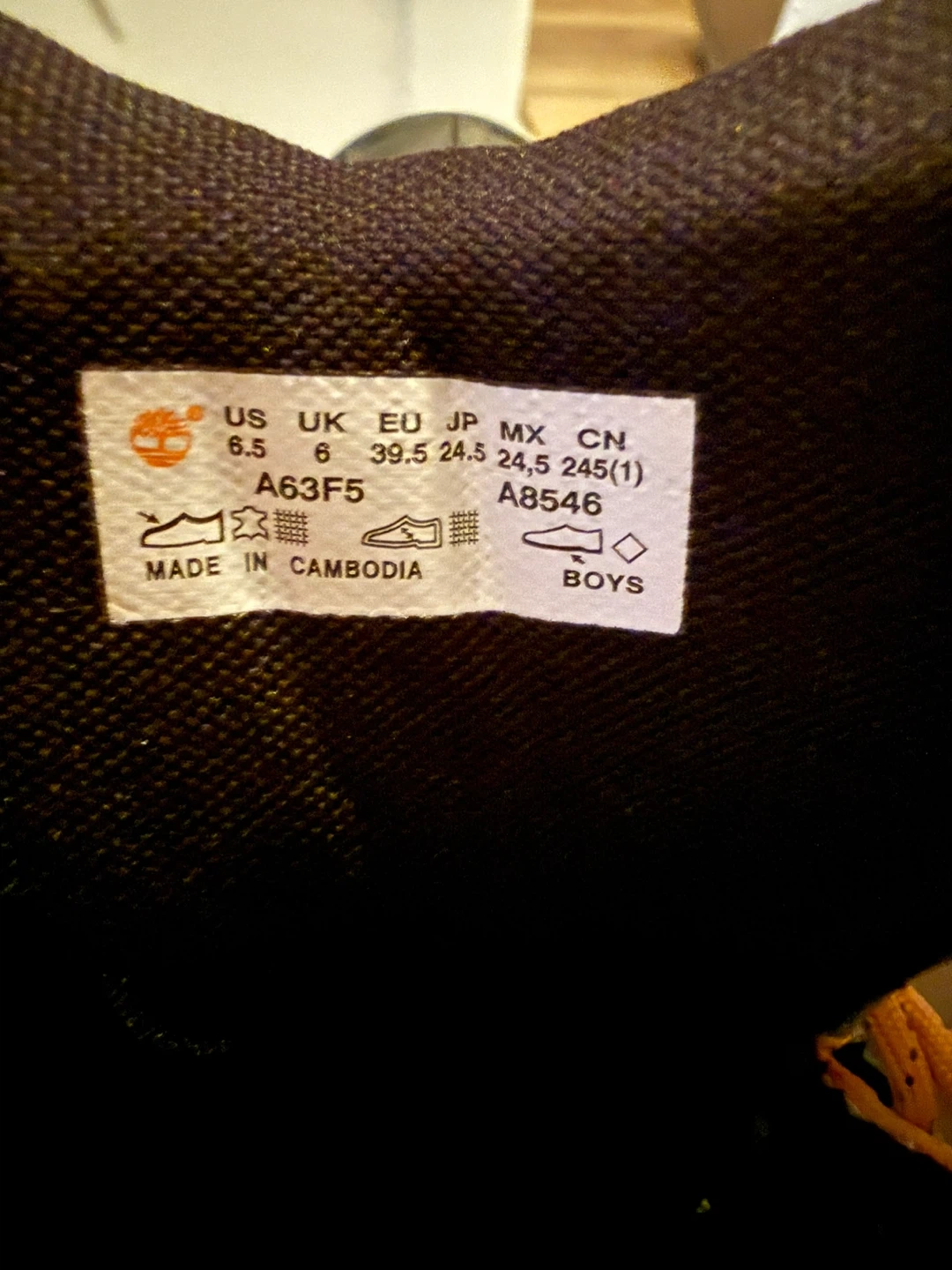 Timberland boys' waterproof boots in a tan and black colourway. These boots are size 6.5 US, 6 UK, 39.5 EU, 24.5 MX, 24.5 CN. They're made in Cambodia. Perfect for keeping little feet dry in wet weather!