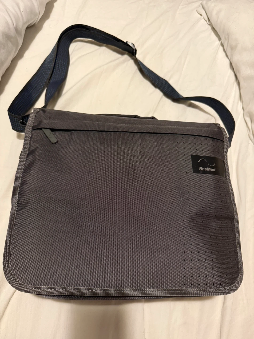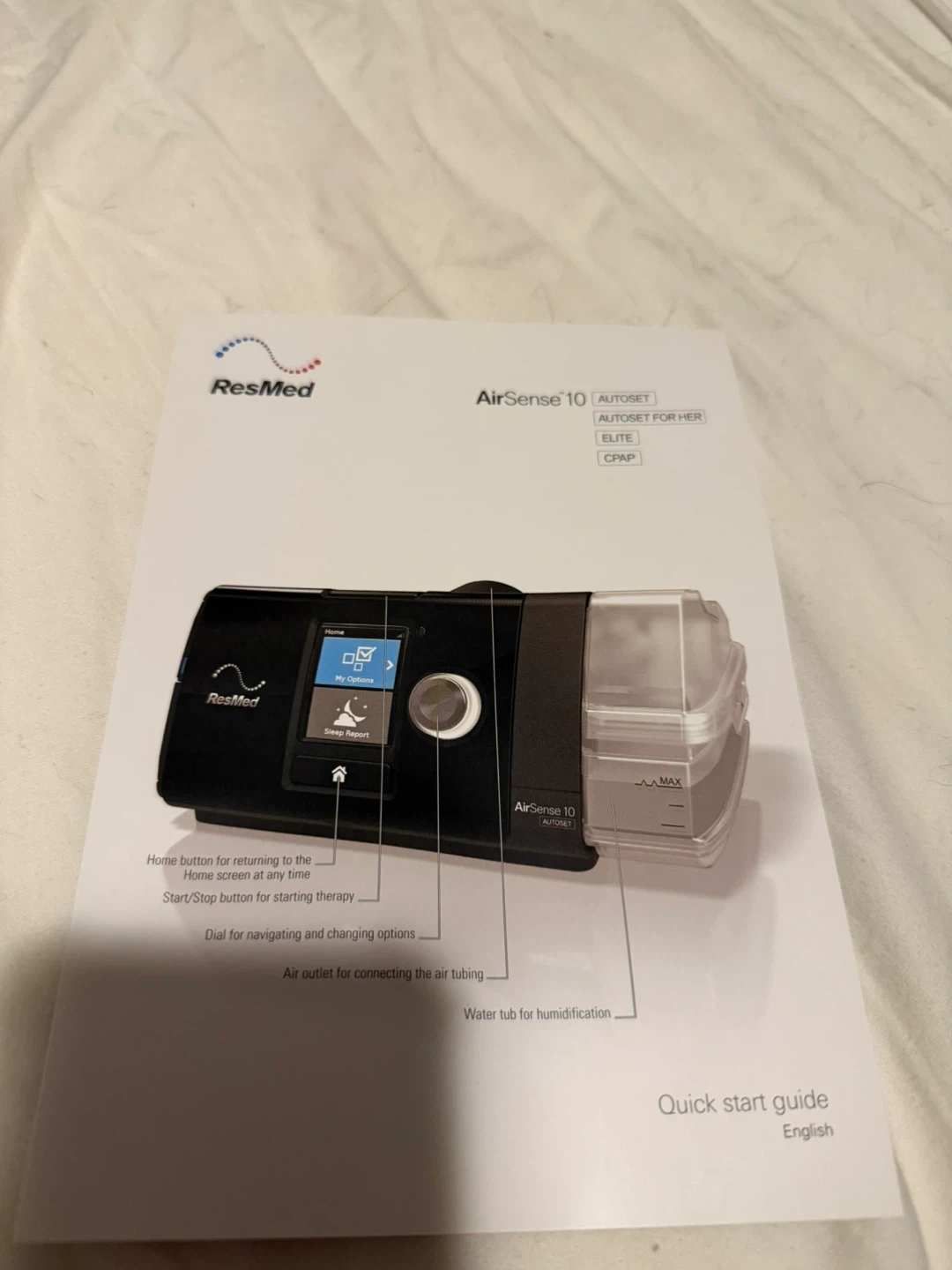 This ResMed AirSense 10 Autoset CPAP machine comes with a travel bag and a quick start guide. It's designed for sleep therapy and includes the main unit, humidifier, power adapter, and various accessories. This setup is great for use at home or while travelling.