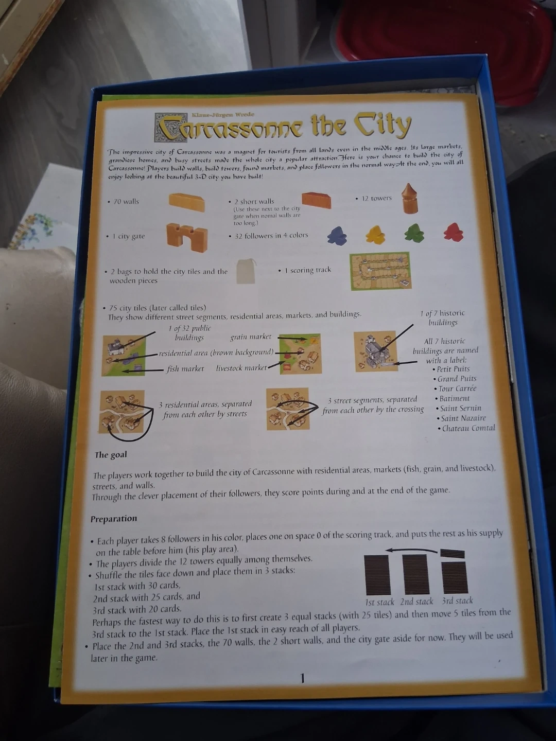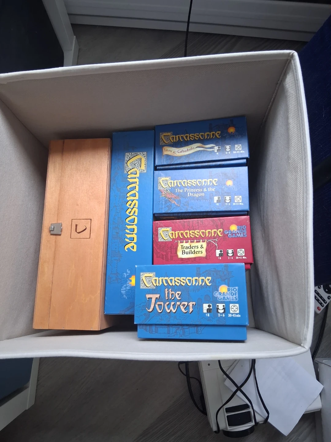 This is the original Carcassonne board game by Klaus-Jürgen Wrede. It includes the base game along with several expansions like Inns & Cathedrals, Traders & Builders, The Princess & The Dragon, and The Tower. The wooden box version keeps everything organized. It's great for strategy game nights!