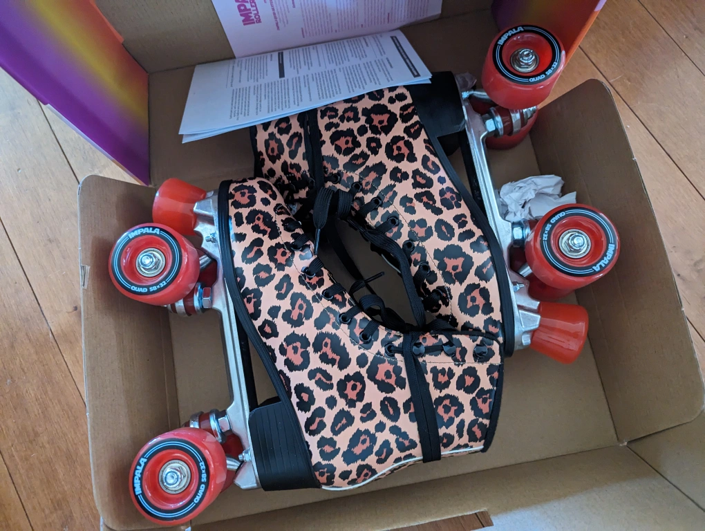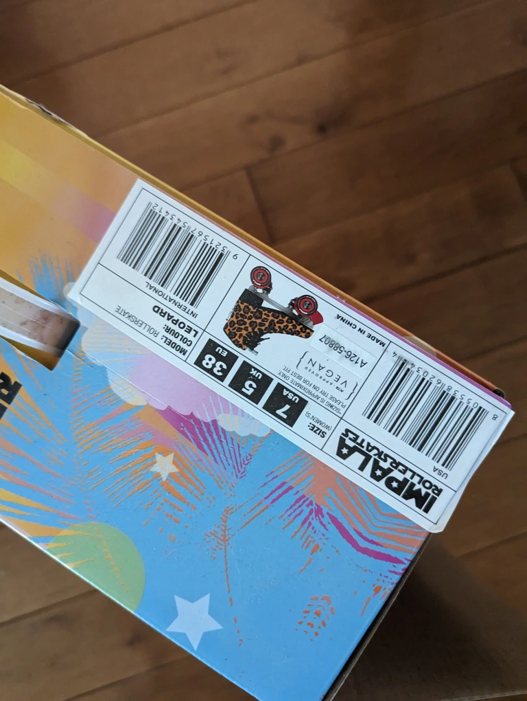 Selling a pair of Impala roller skates in the Leopard colour. They are a women's size 7. These vegan skates come in their original box