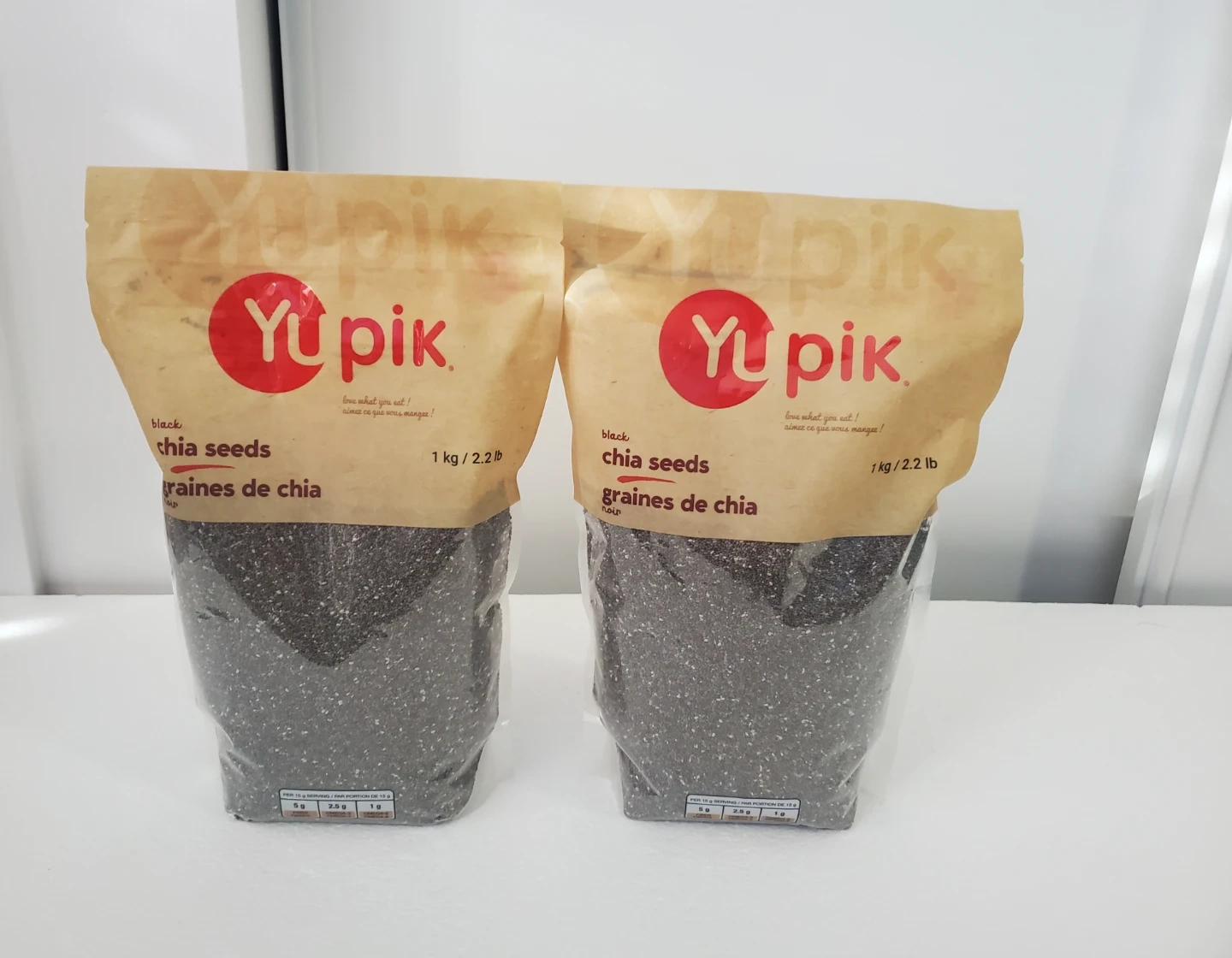Yupik black chia seeds, 1 kg per bag. These seeds are a good source of fibre and protein. They're great for adding to smoothies or yogurt.