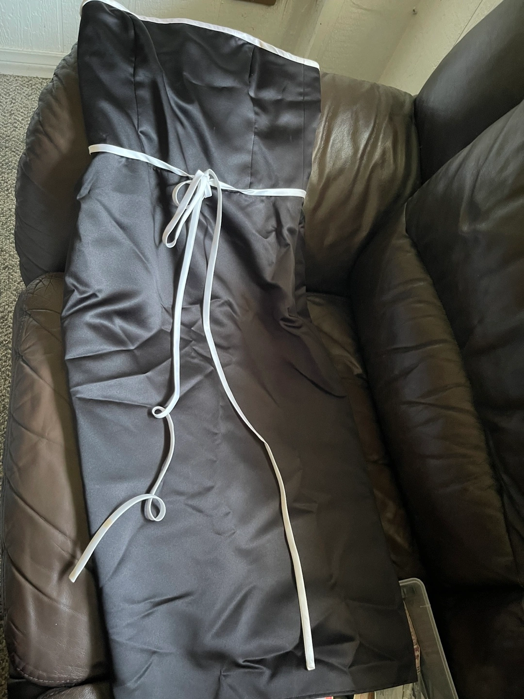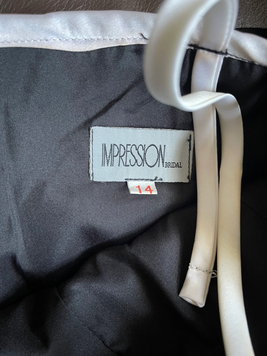 Selling a lovely silk black dress from Impression Bridal in size 14. It's in great condition and ready for a new home! Worn once for wedding.The dress features a sleek design with white piping and white spaghetti straps! Very cute!