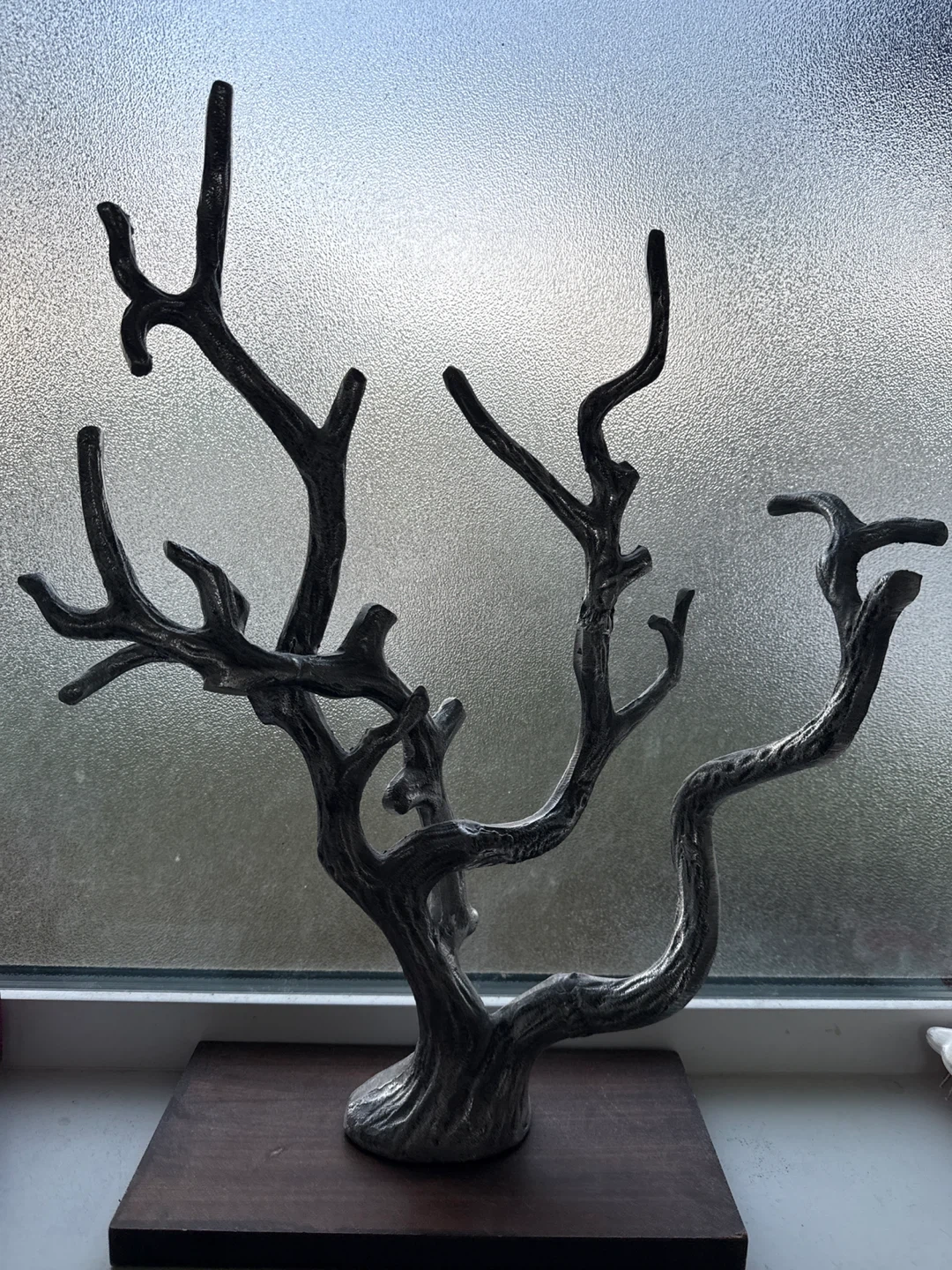 This decorative metal tree sculpture features a dark, textured finish and sits on a wooden base. It's designed to resemble bare branches.