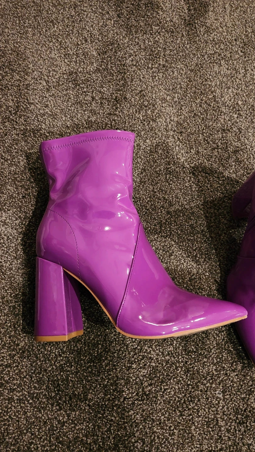 These eye-catching ankle boots feature a glossy purple patent finish. They have a pointed toe and a chunky block heel for a bold look. Side zippers for easy on and off.