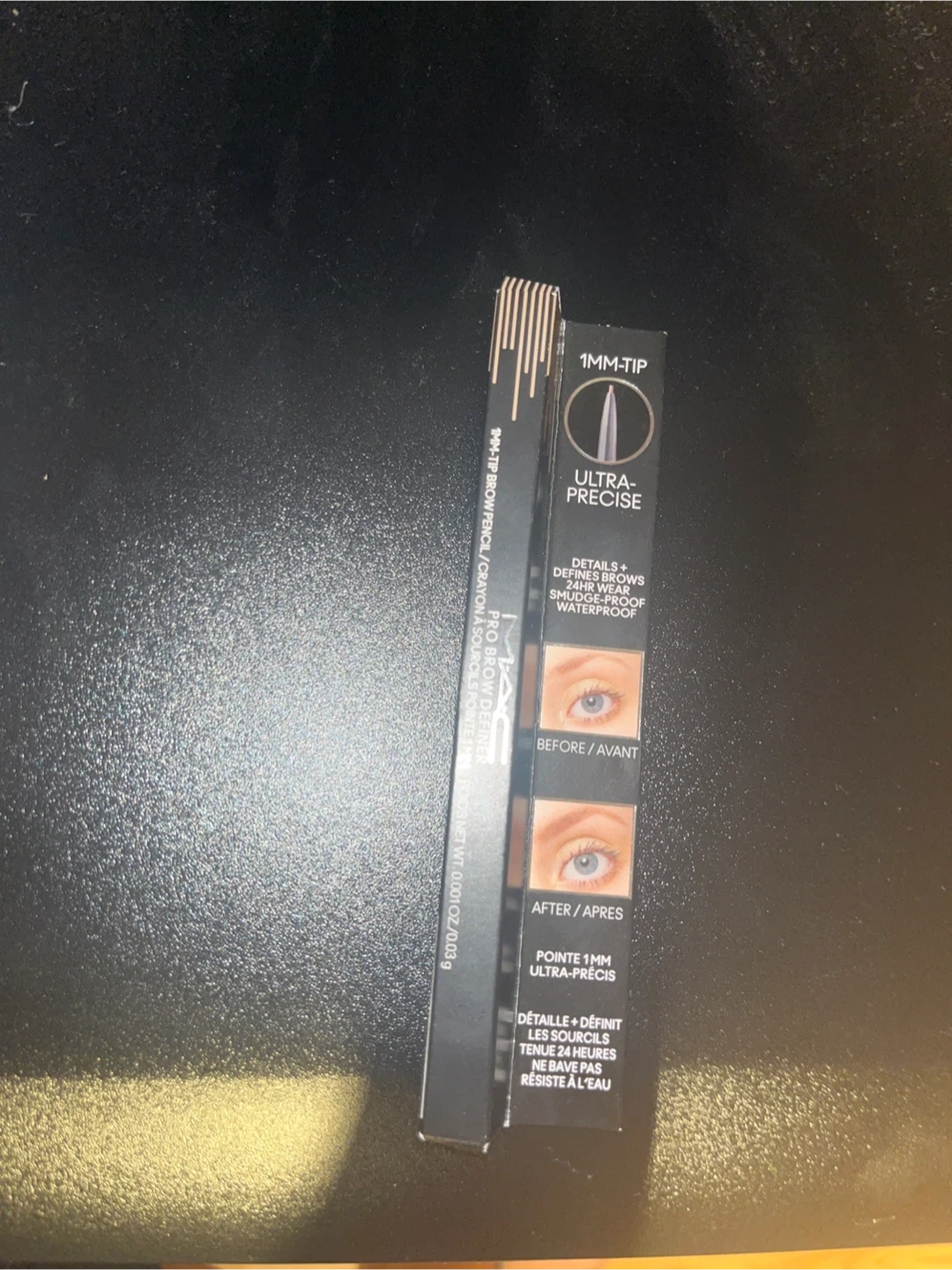 This is a MAC Pro Brow Definer with a 1mm tip. It's designed for ultra-precise definition and lasts up to 24 hours without smudging. The formula is waterproof for all-day wear.