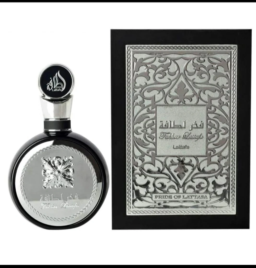 This is Lattafa Fakhr Al Lattafa Eau de Parfum. It's a 100ml bottle. The fragrance comes in an ornate black and silver presentation box.