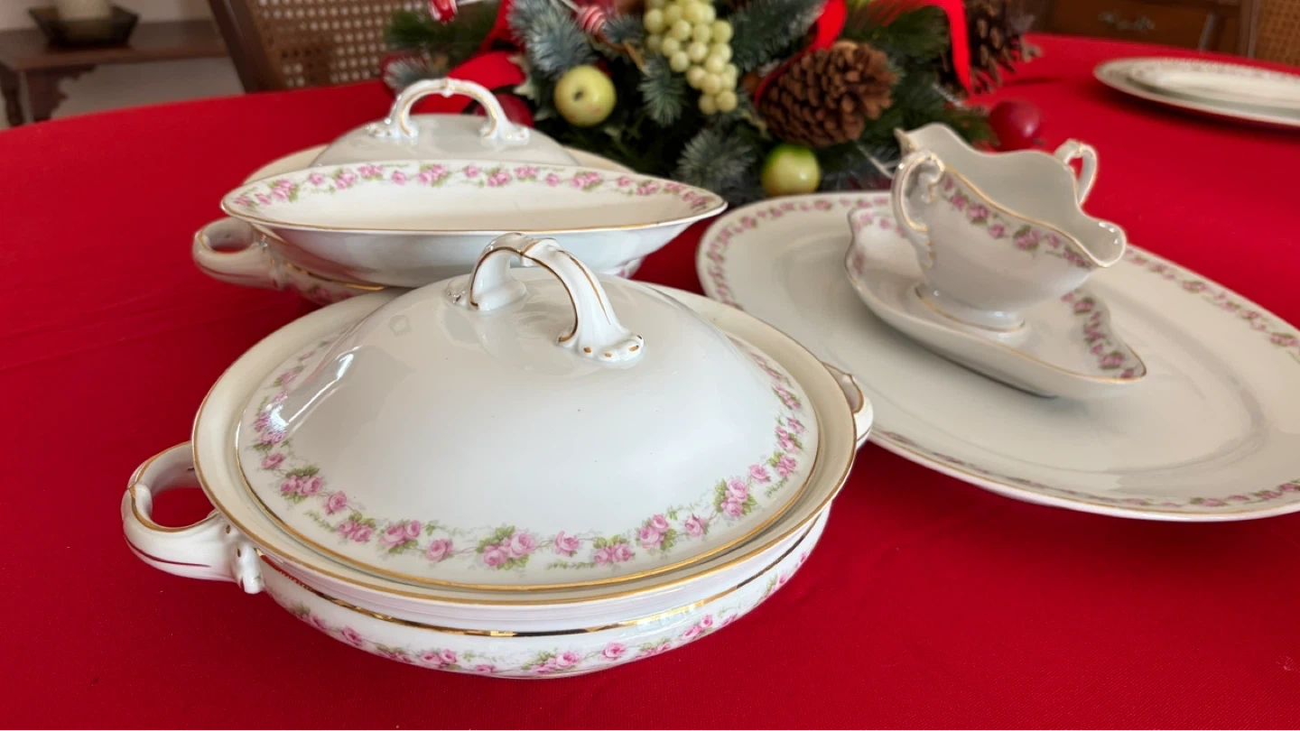 This elegant porcelain serving set features a delicate pink rose pattern with gold trim. It includes a large oval platter, a covered tureen, a serving dish, and a gravy boat with saucer. It's perfect for special occasions and holiday meals.