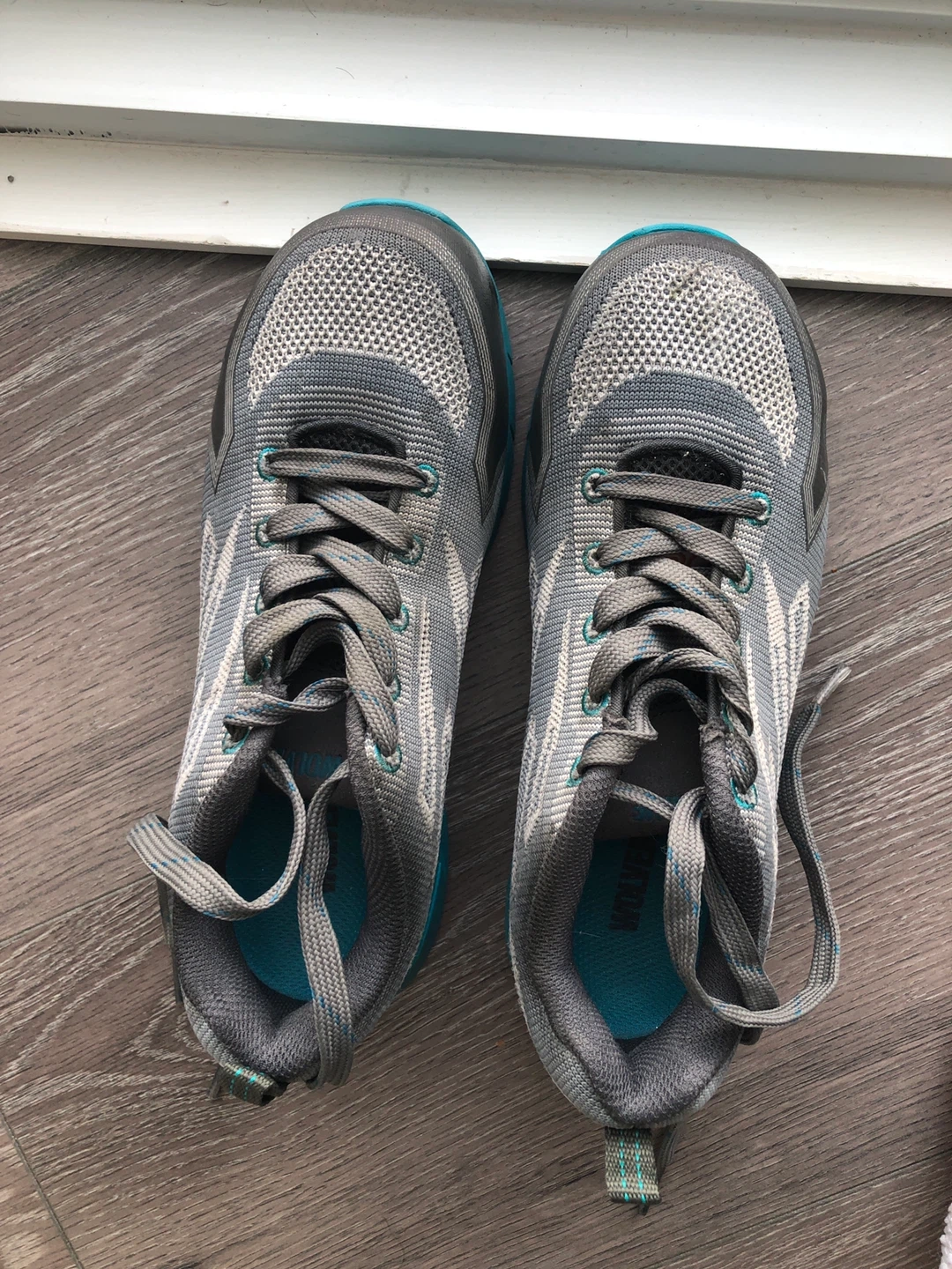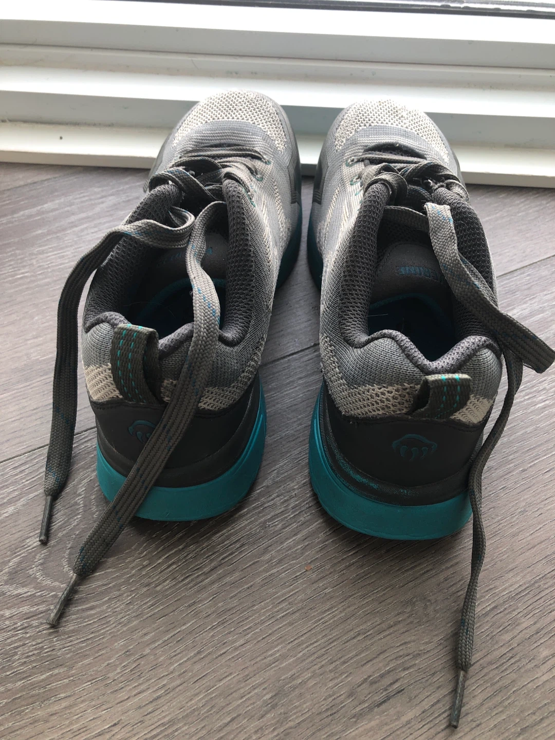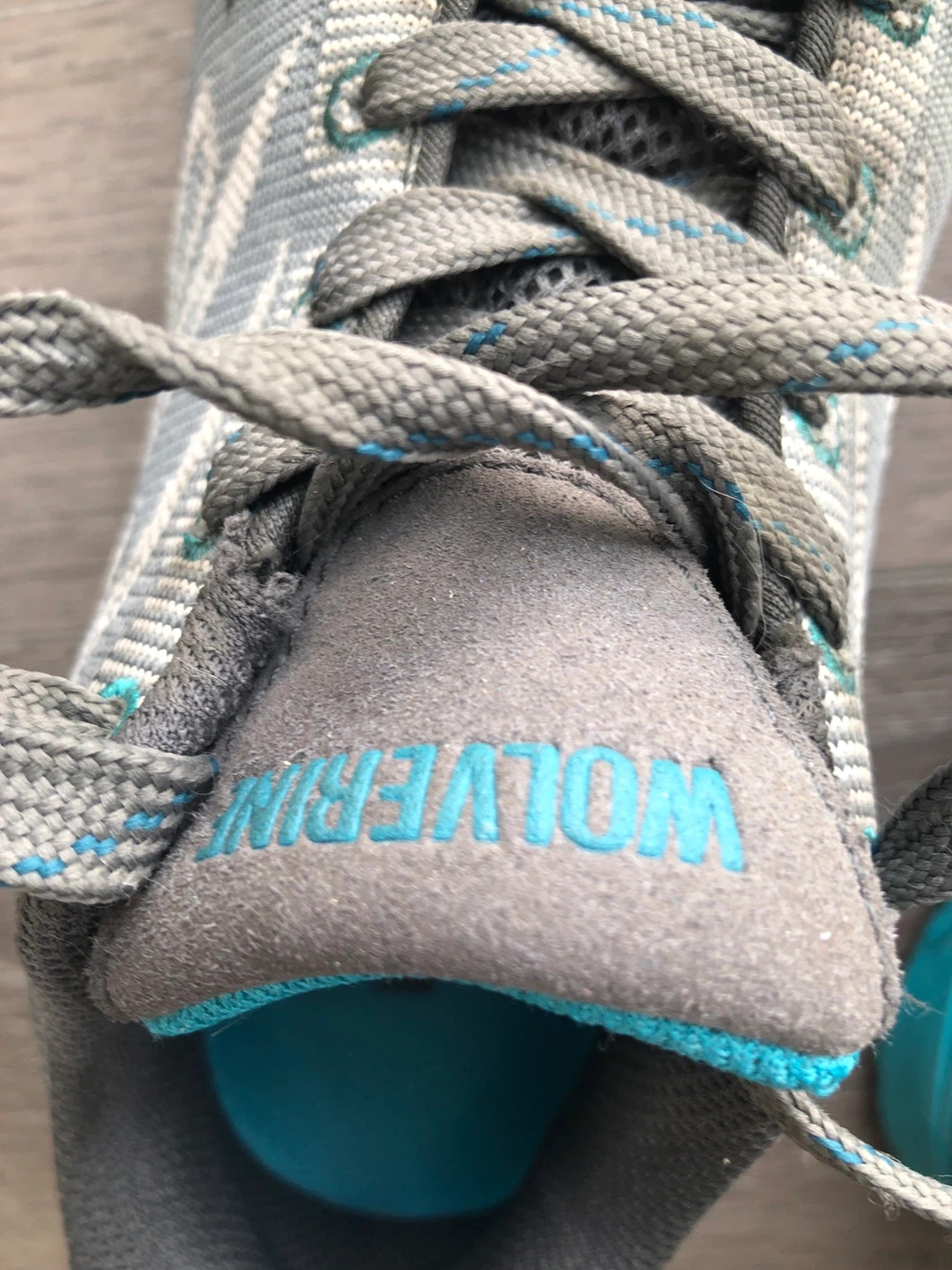 These Wolverine Steel toe shoes are grey and teal. They are a women's size 5.5 US, 3.5 UK, and 36 EUR. Mesh upper and rubber sole. Check out my other listings. Combo deals when buying multiple items.