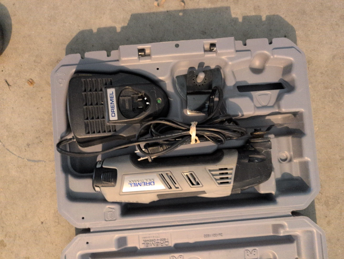 This is a Dremel Multi-Max oscillating tool kit. Oscillating speed control available. It comes with the tool, a charger, and the original case. It's a handy tool for various cutting and sanding tasks.