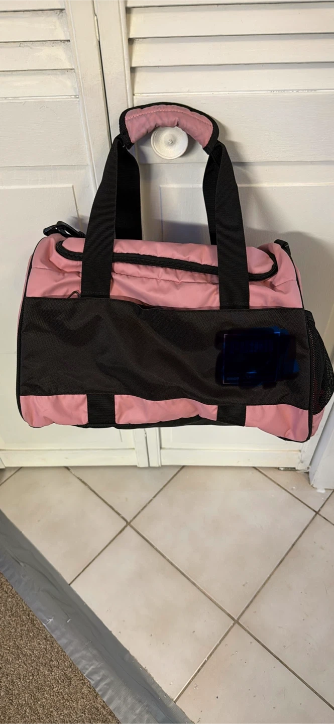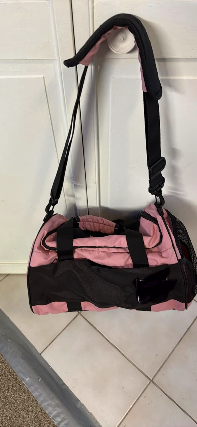 Puma duffle Bag - This is a pink and black duffle bag with black straps. It has a padded handle and an adjustable shoulder strap. It also features a side mesh pocket.