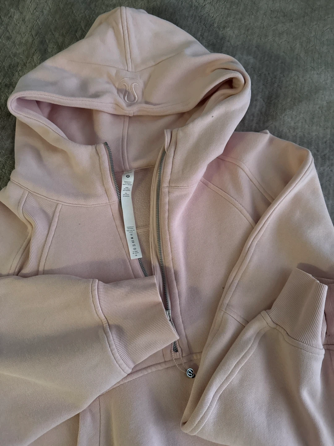 This is a Lululemon Scuba Oversized Half-Zip Hoodie in Pink Mist. It's a size XL/XXL. The hoodie is made of a soft cotton blend material. It's perfect for everyday wear!