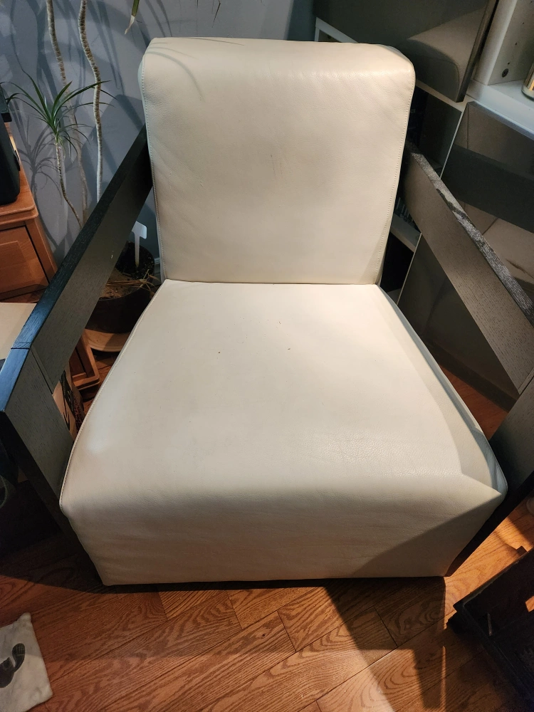 Very comfortable off-white leather chair. Dark brown wooden frame. Great for living room or office. Excellent used condition. Offering both chairs for $100.