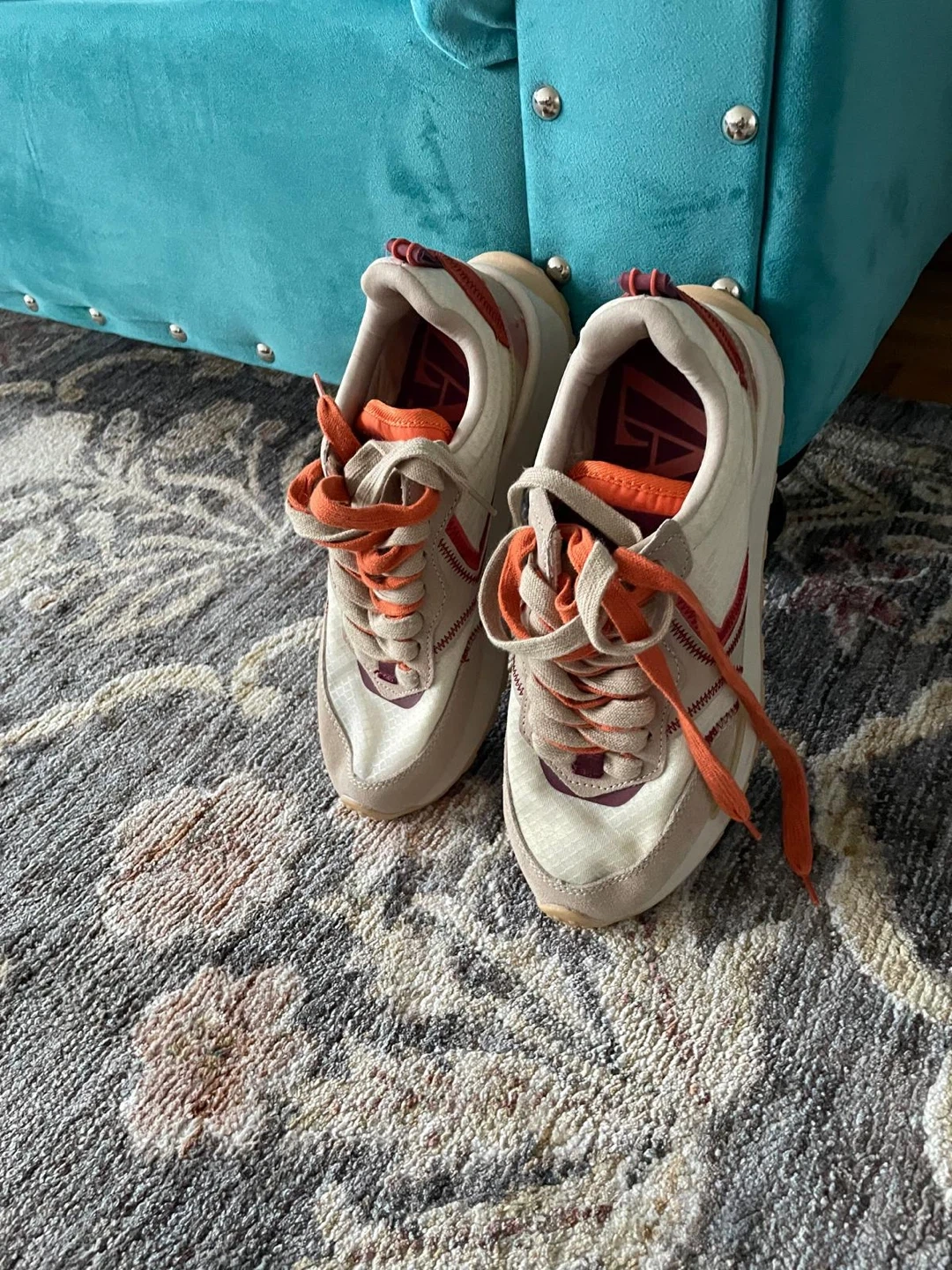 Zara shoes sneakers in a cream and tan colourway with orange laces. Textile and suede uppers. Rubber soles.