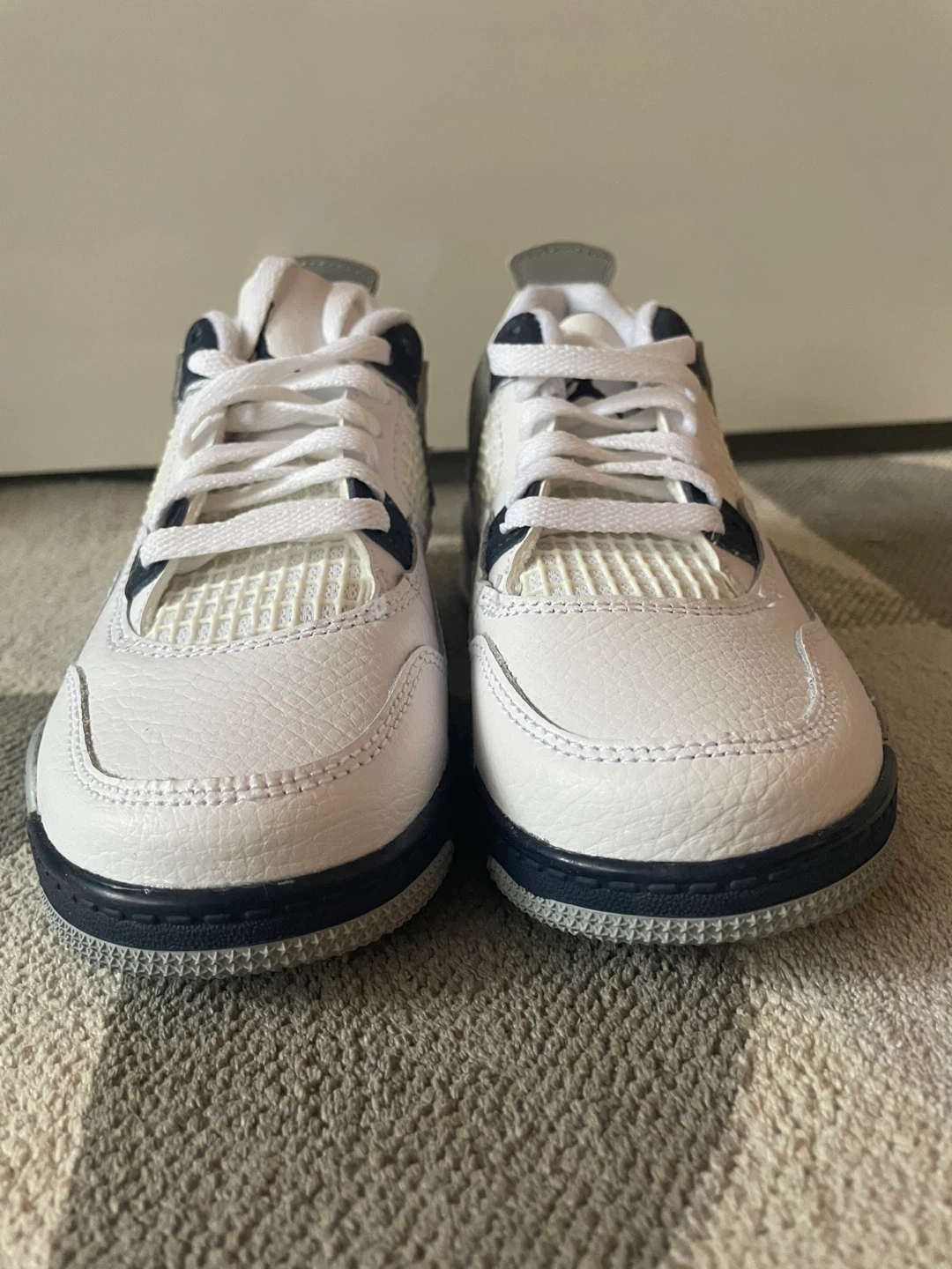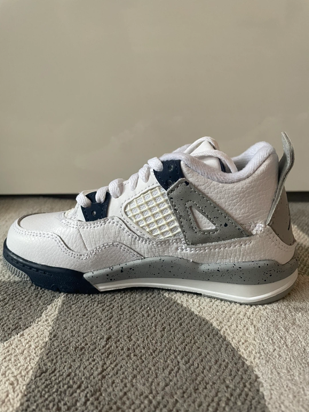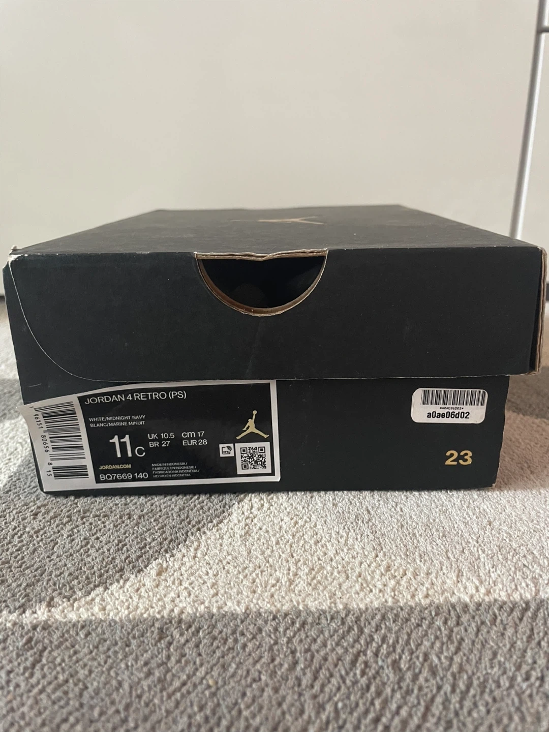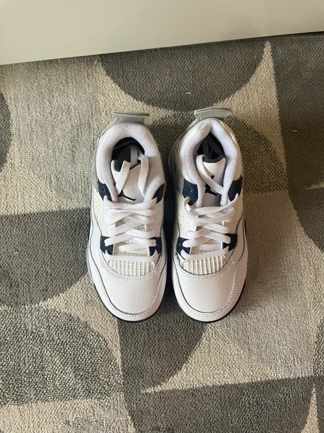 Toddler Jordan 4 Retro (PS) shoes. White with midnight navy accents. Size 11