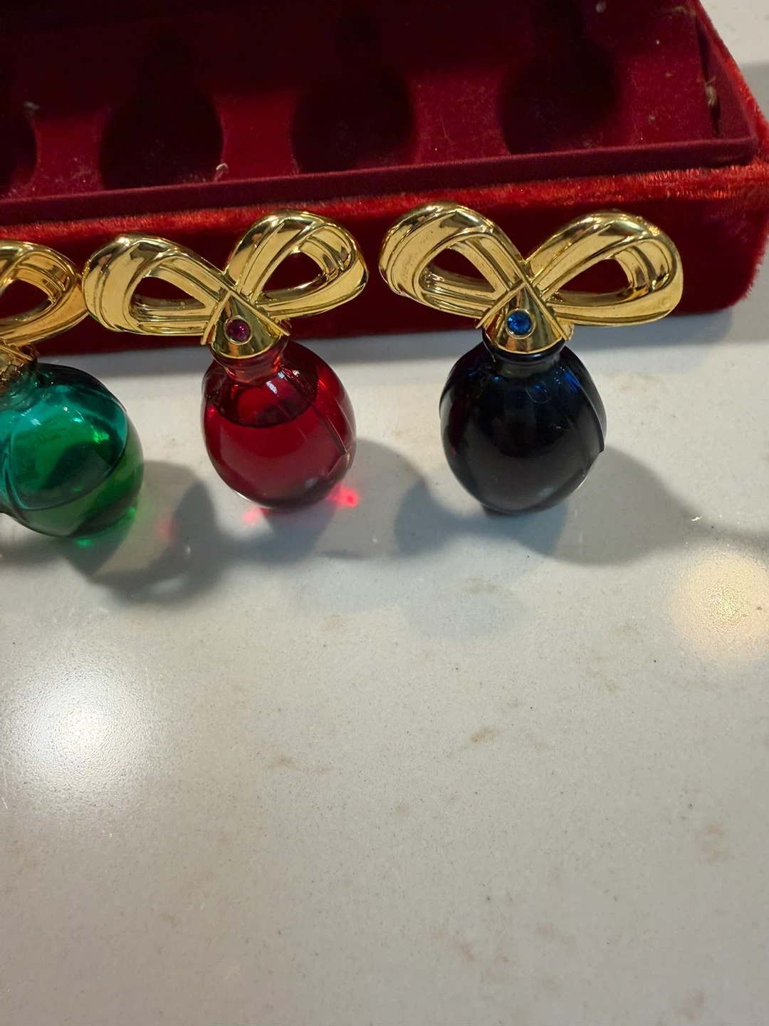 Elizabeth Taylor’s vintage collection set of miniature perfume ornaments, complete with their original red velvet box! These decorative perfume bottles feature a gold-tone bow design and come in a variety of colours: amber, green, red, and black All have perfume in them except for the green one is only half full.
