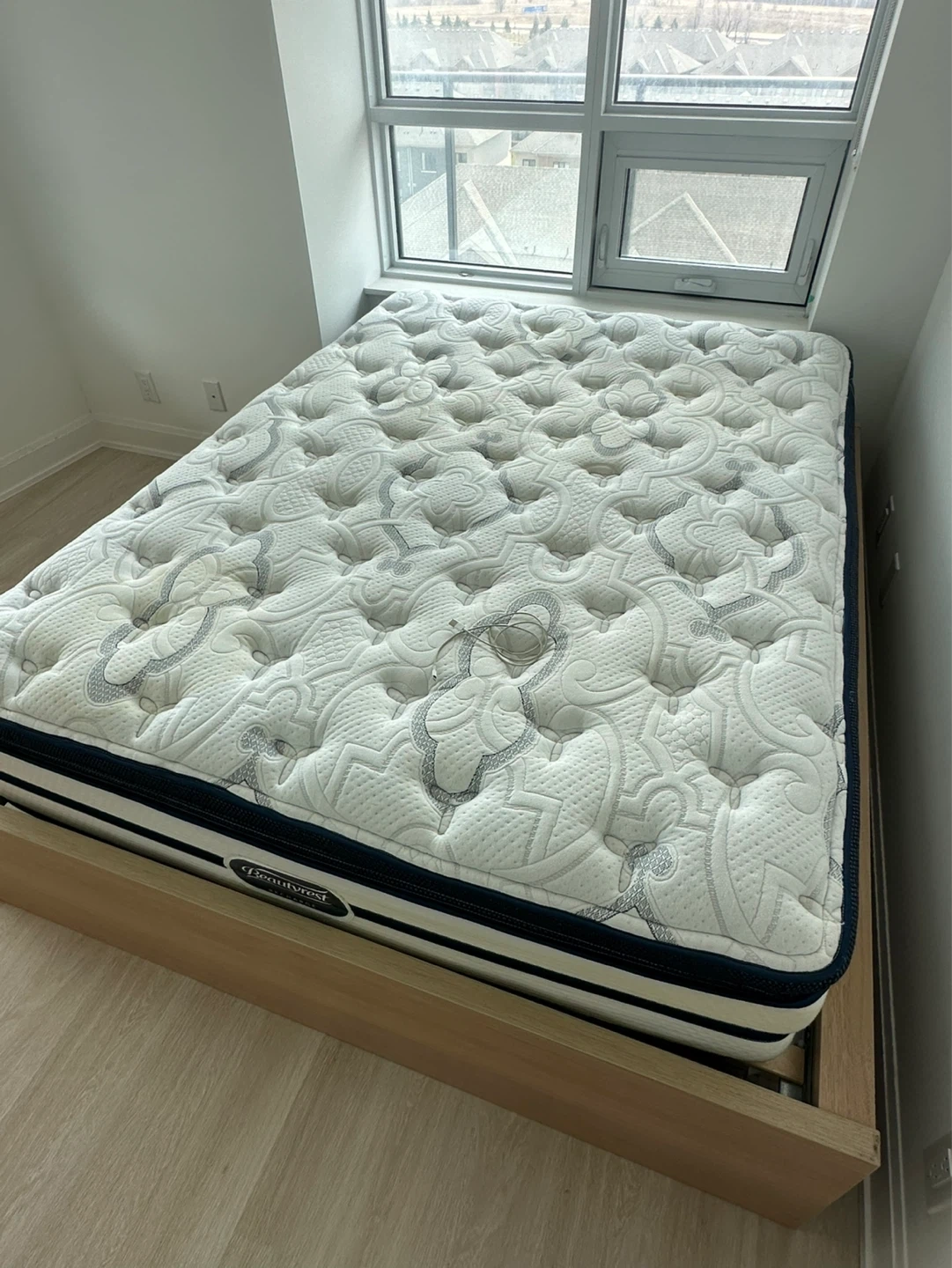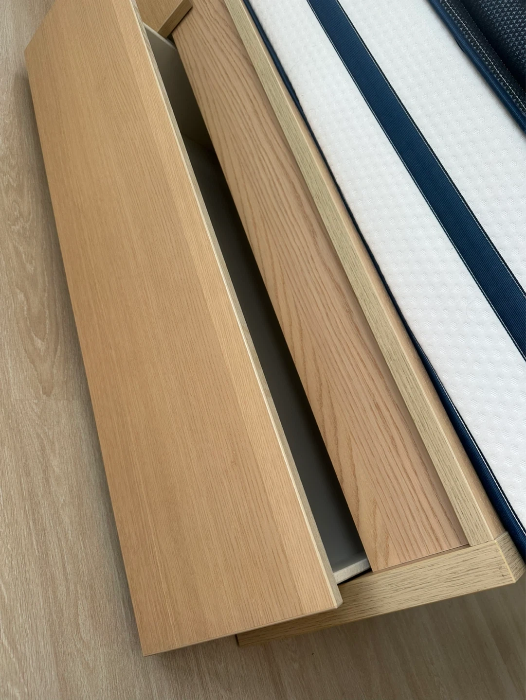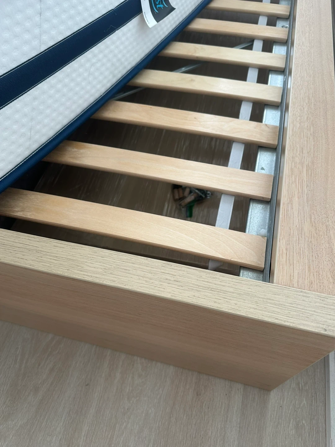 Selling a wooden bed frame. Frame includes wooden slats and has built-in drawers for storage. Perfect for a bedroom needing a complete bed setup! It comes with head board, but I didn’t have it installed!