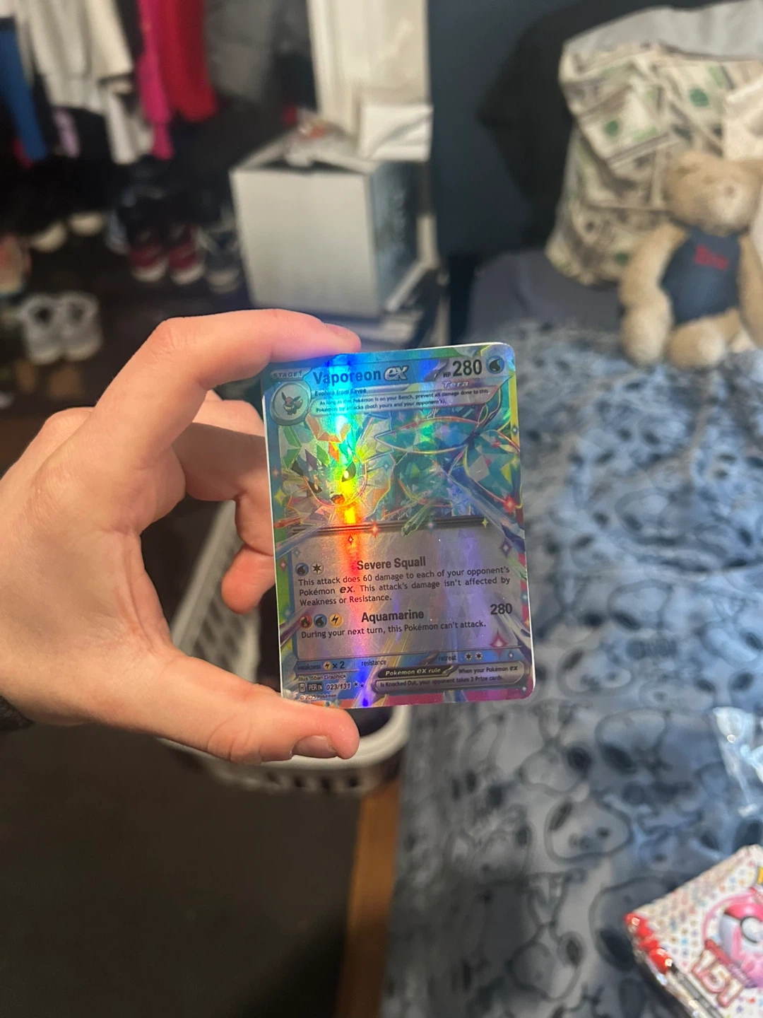 This is a Vaporeon EX Pokémon trading card. It has a Severe Squall attack that does 60 damage to each of your opponent's Pokémon EX. It also has an Aquamarine ability that prevents attacking during your next turn. I found it in my basement wanna get rid of it.
