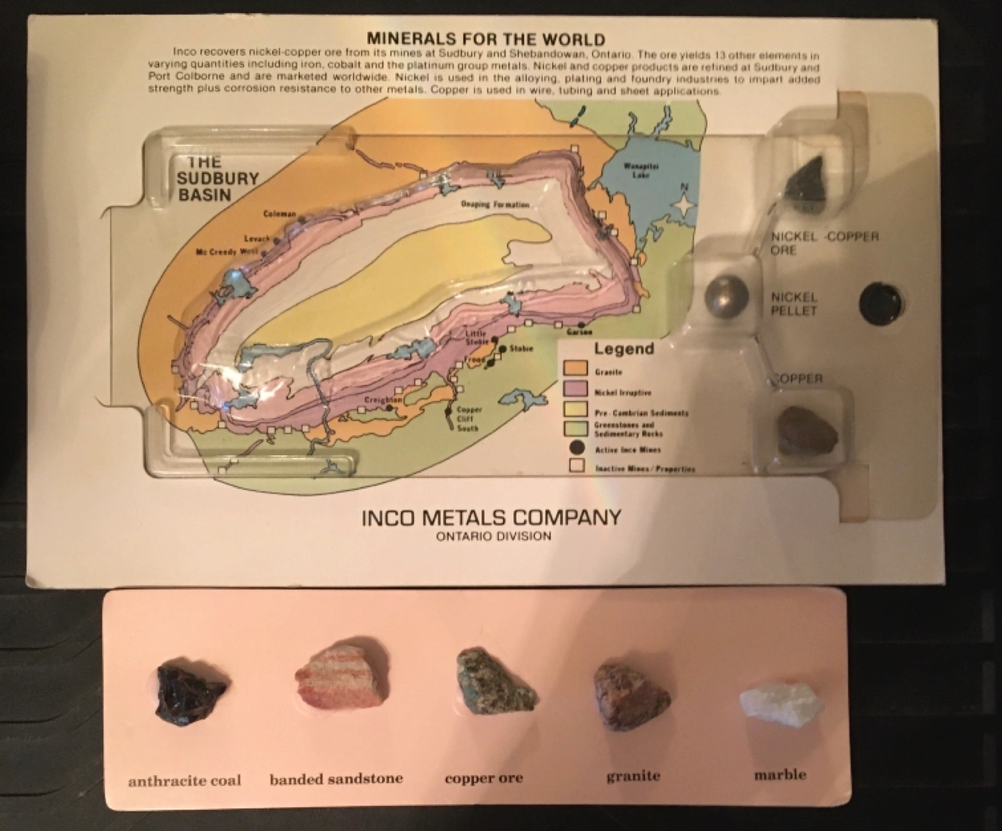 361This vintage Inco Metals Company display showcases minerals for the world, recovered from mines in Sudbury and Shebandowan, Ontario. It includes nickel-copper ore, nickel pellet, copper, anthracite coal, banded sandstone, copper ore, granite, and marble. This item is in excellent condition. If the ad is up, it's still available! Don't miss out on this piece of Canadian mining history!