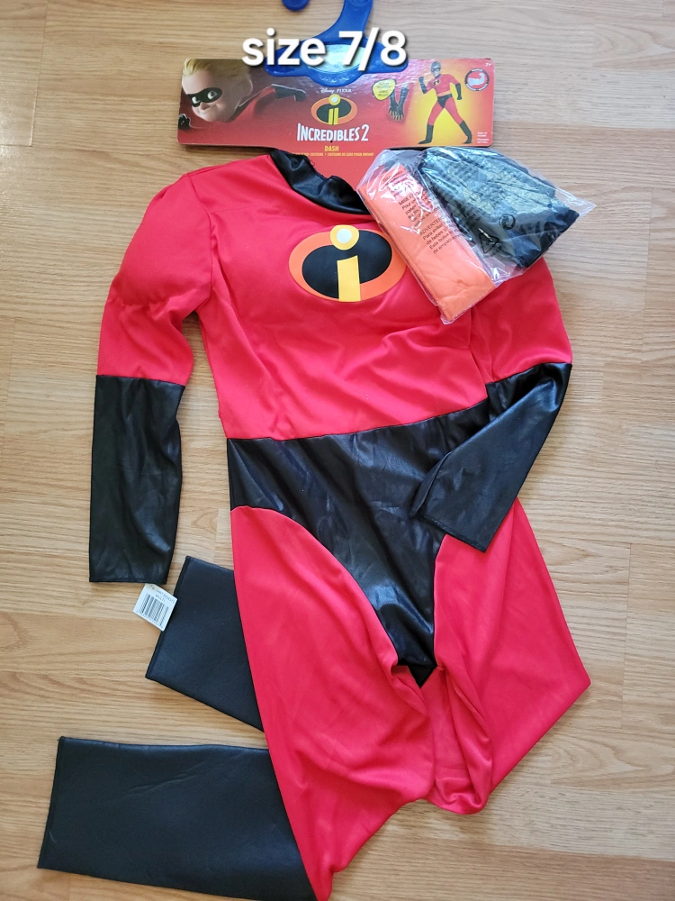 Get ready for some super-speed adventures with this Incredibles Dash costume! This costume is in size 7/8 and includes the main outfit and headpiece. Perfect for Halloween or dress-up fun!