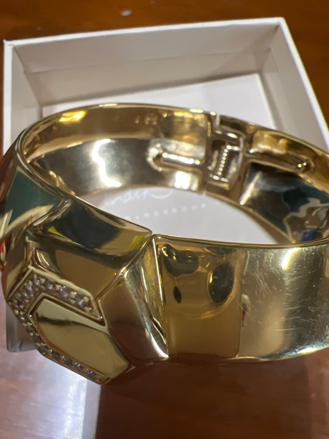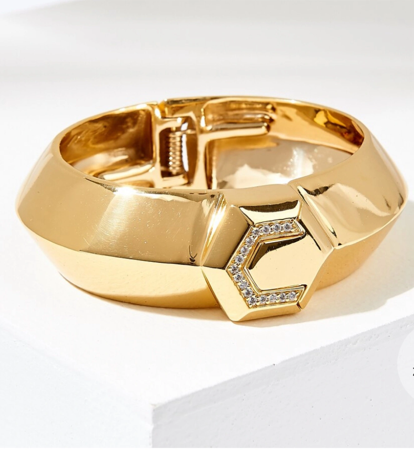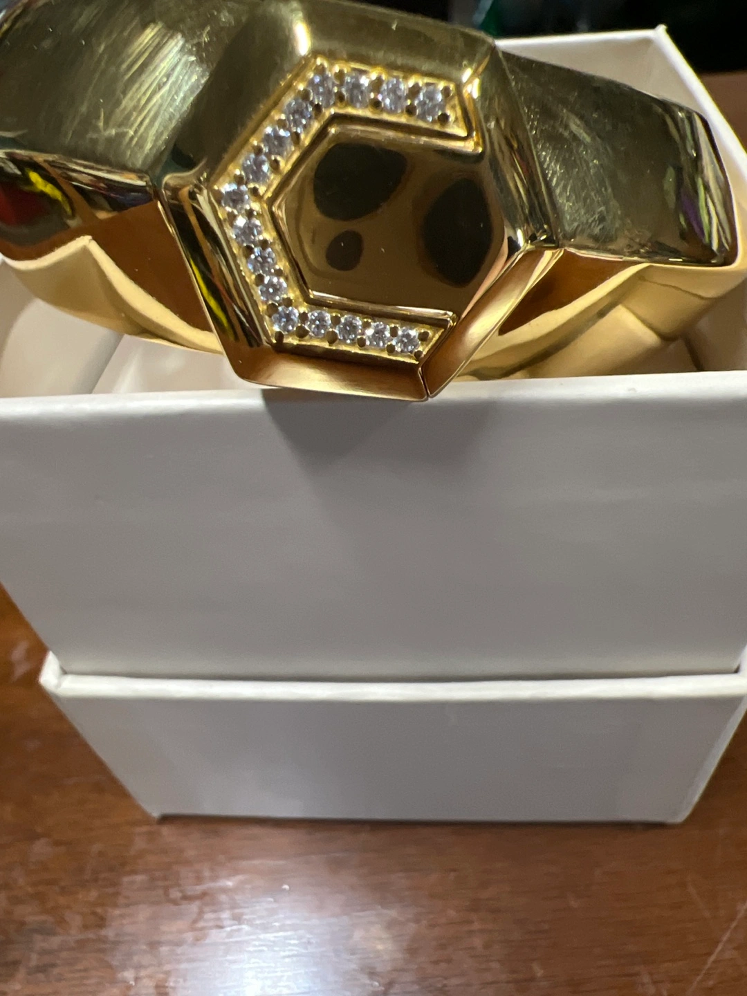 60This India Hicks bracelet features a striking geometric design in a warm gold tone, making it a standout piece in any jewelry collection. The bracelet's bold, angular cut-outs create a captivating play of light and shadow, adding a modern, sculptural quality to its appearance. Perfect for those who appreciate contemporary elegance and craftsmanship. NIB Retired- 3 available Cross posted