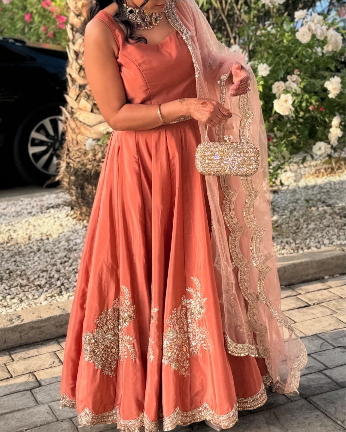 5Beautiful Indian lehenga dress set in a lovely peach colour with gold embroidery. Includes the skirt (lehenga), top (choli), and scarf (dupatta). Perfect for weddings or special occasions!