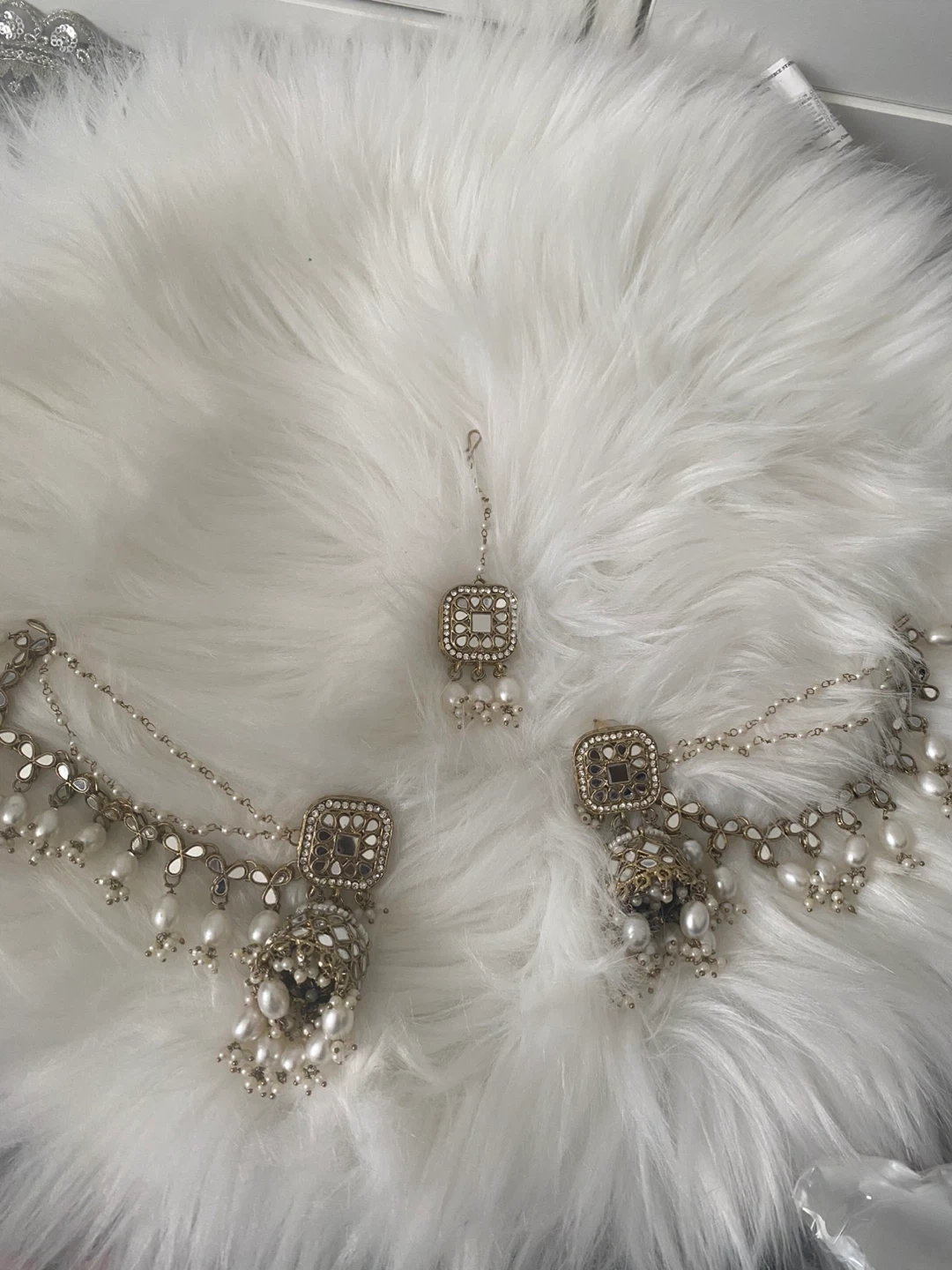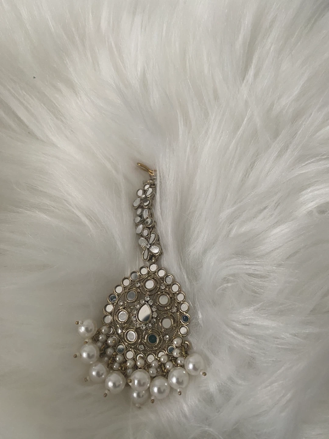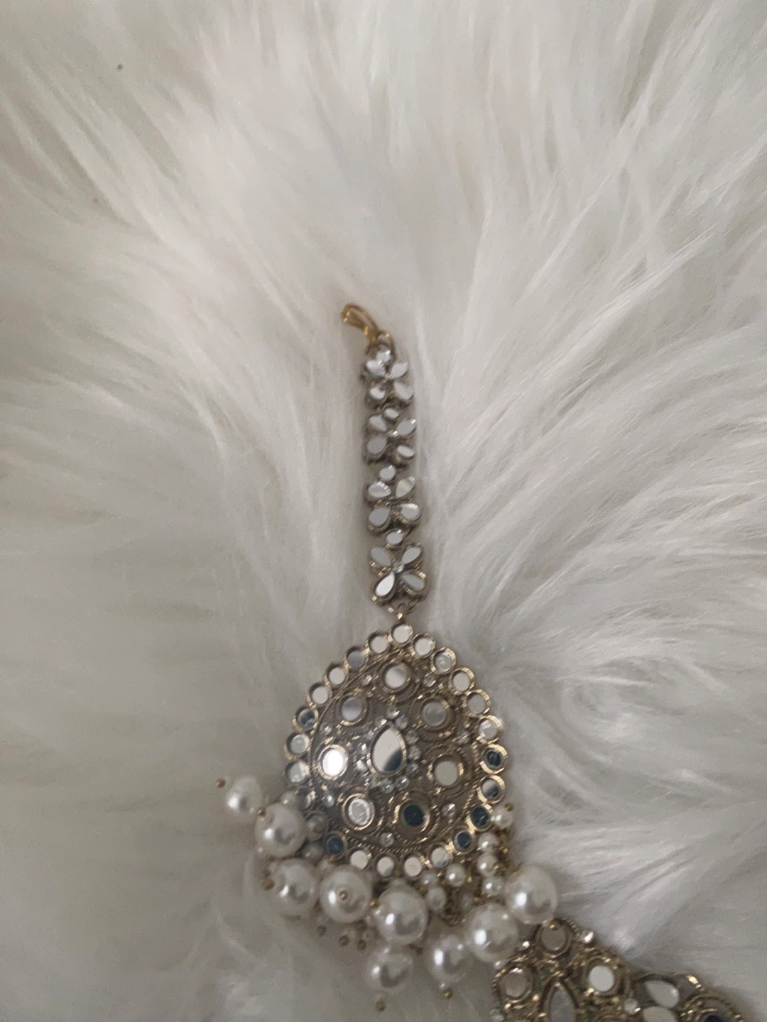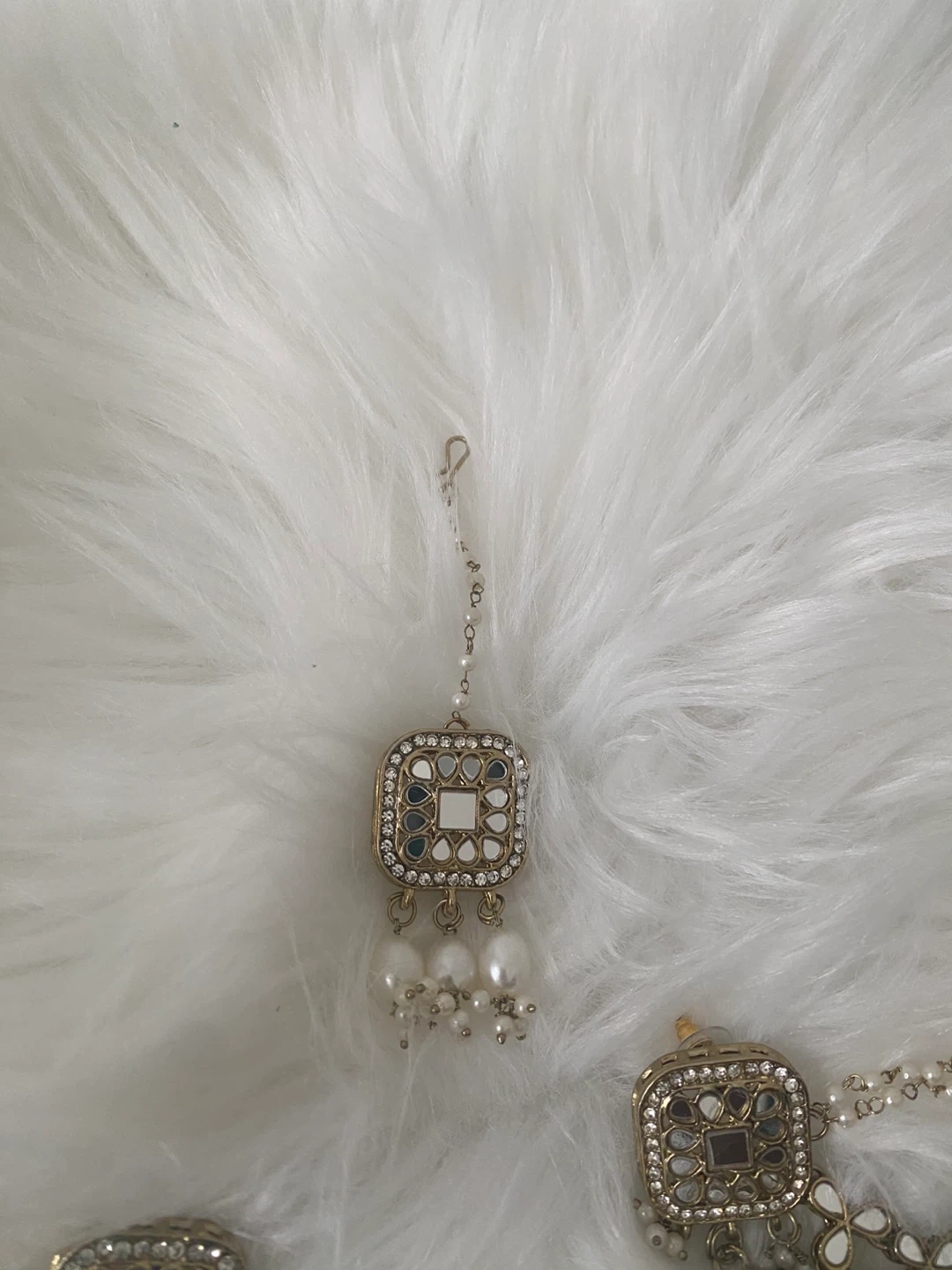 Beautiful Indian/Pakistani jewelry set featuring a tikka (headpiece) and matching earrings. The set is adorned with pearls and intricate detailing. Perfect for weddings or special occasions!
