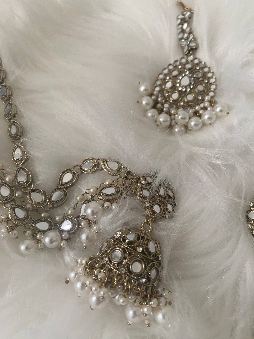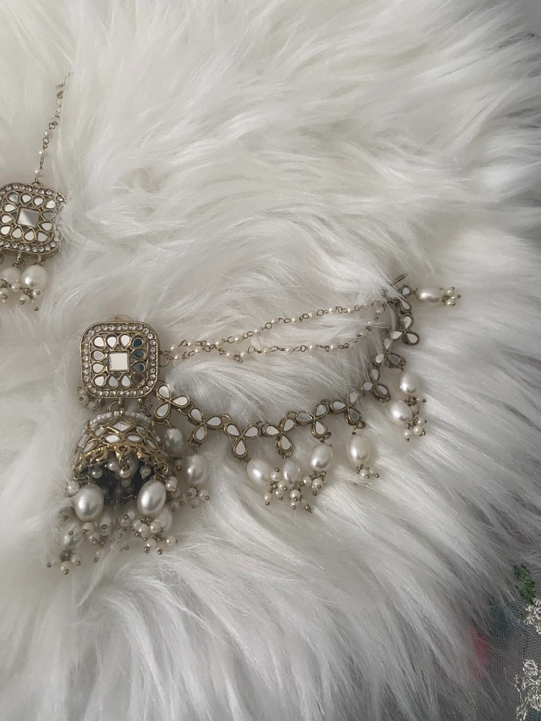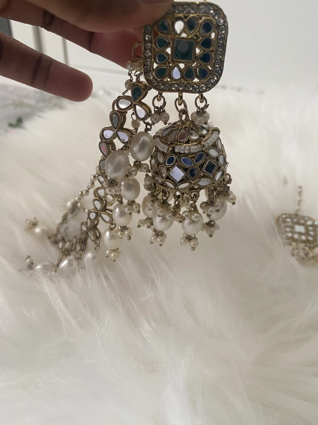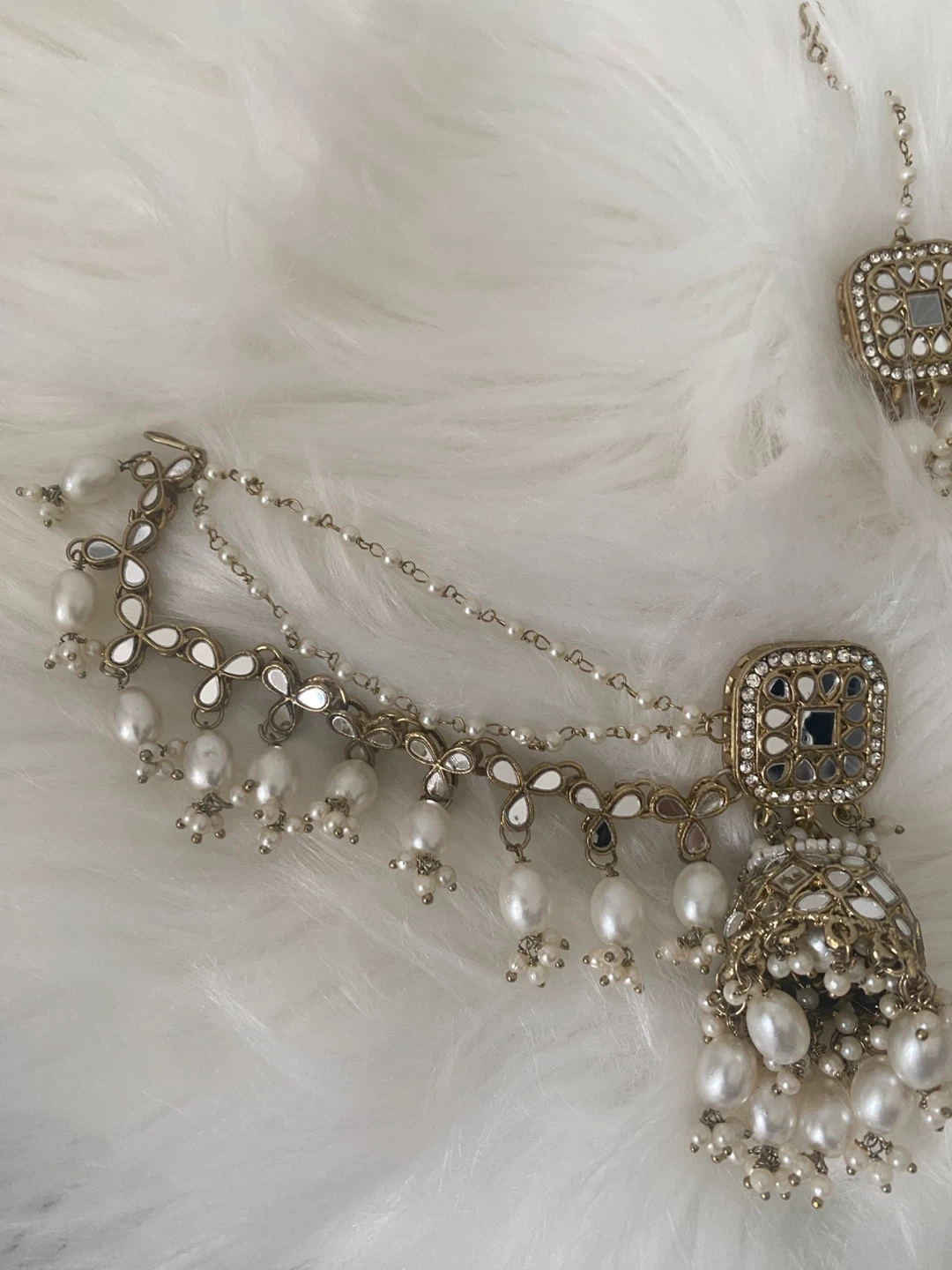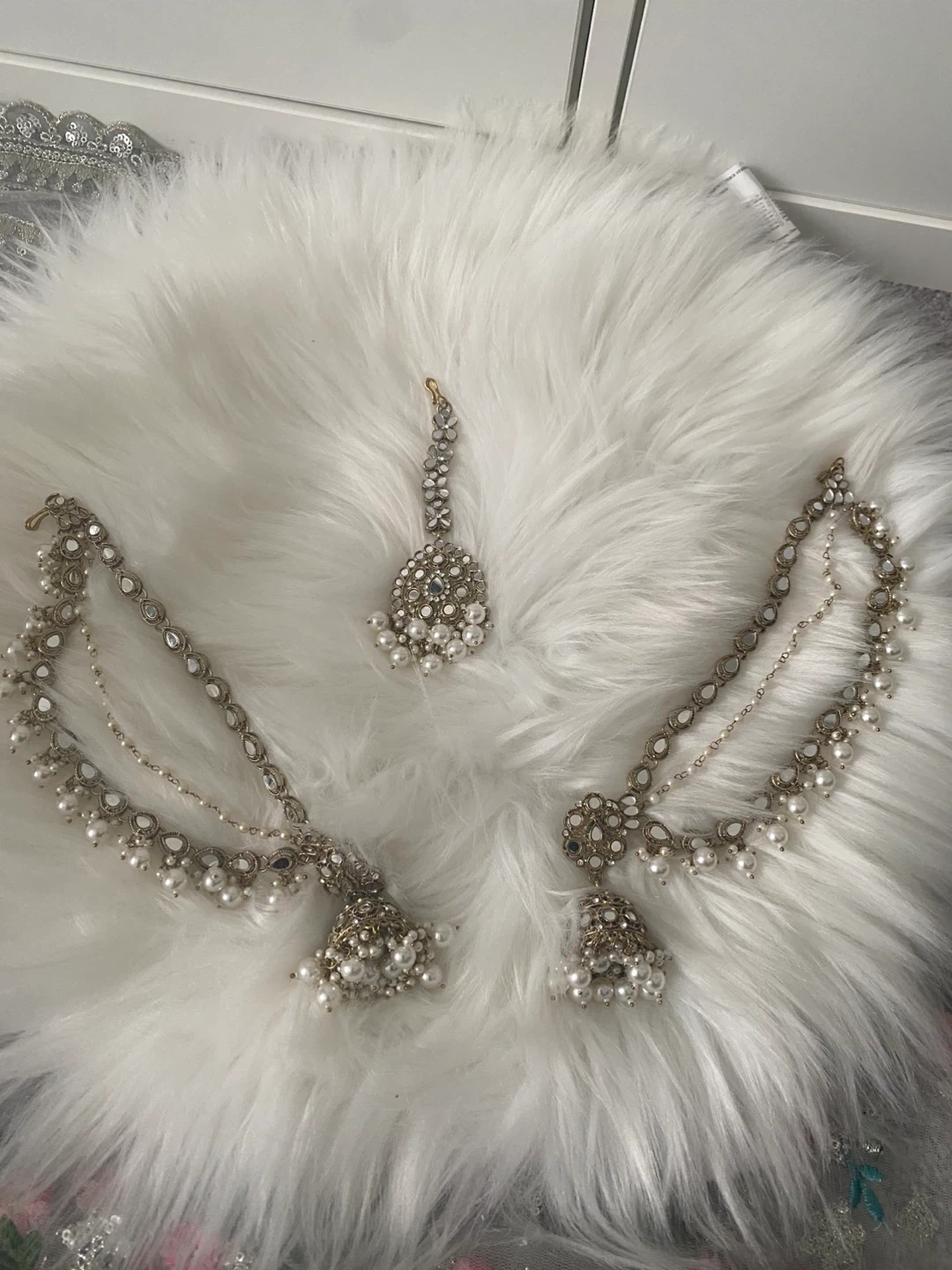 Beautiful Indian/Pakistani jewelry set featuring a tikka (headpiece) and matching earrings. The set is adorned with pearls and intricate detailing. Perfect for weddings or special occasions!