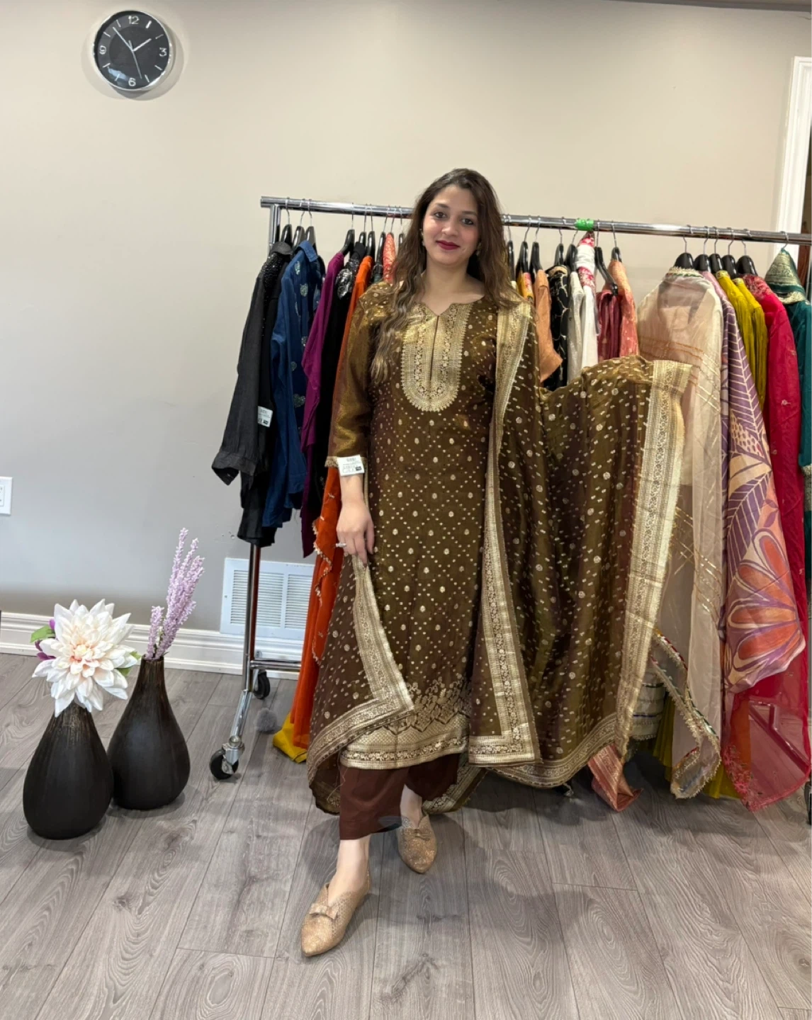 10Beautiful brown Soft Silk Suit with gold embroidery. Perfect for a special occasion! Black Friday Sale 20%Off