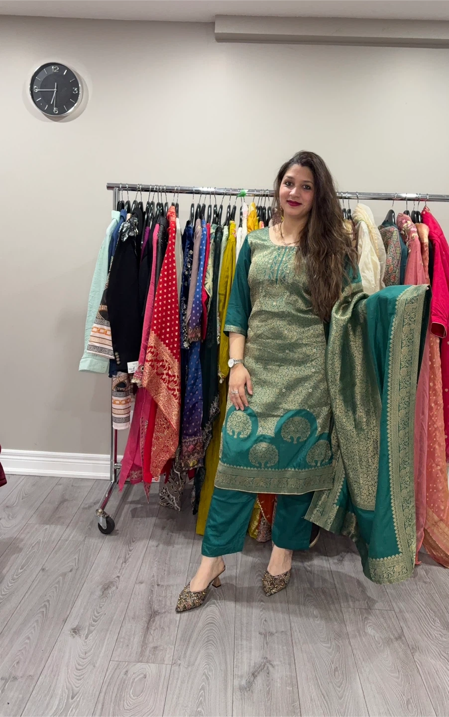 10Beautiful green and gold pant suit. The intricate design and lovely colour make this a stunning outfit for any special occasion.