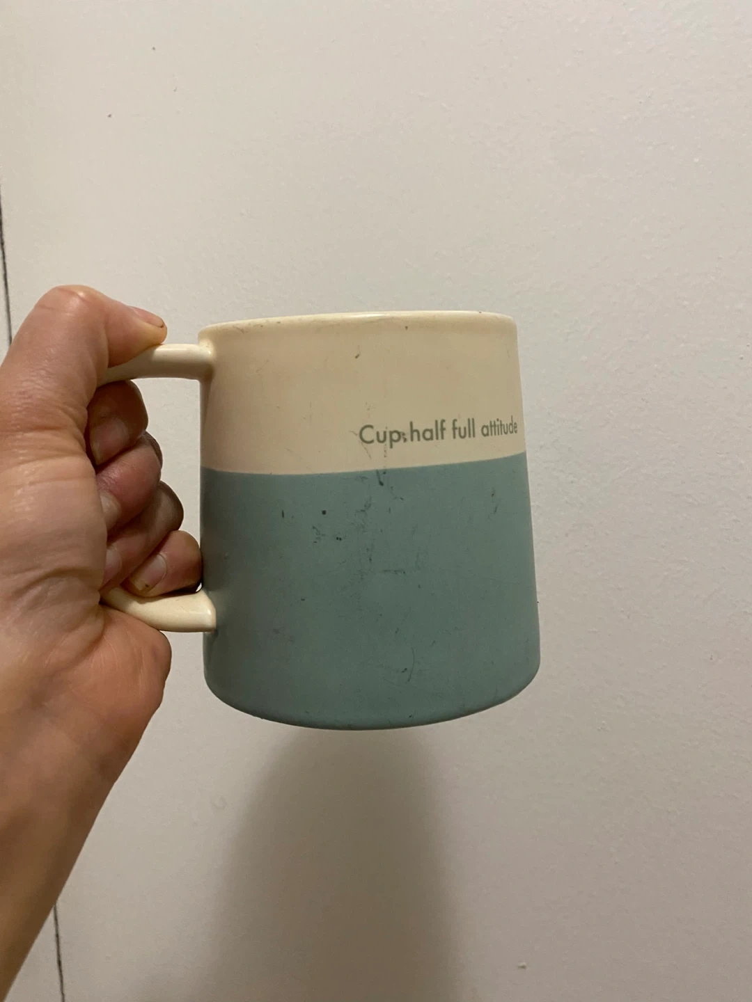 1000+Selling a cute Indigo mug with a two-tone design! The bottom half is a nice blue-green color and the top is cream. It says "Cup. half full attitude" on the front. Dishwasher and microwave safe