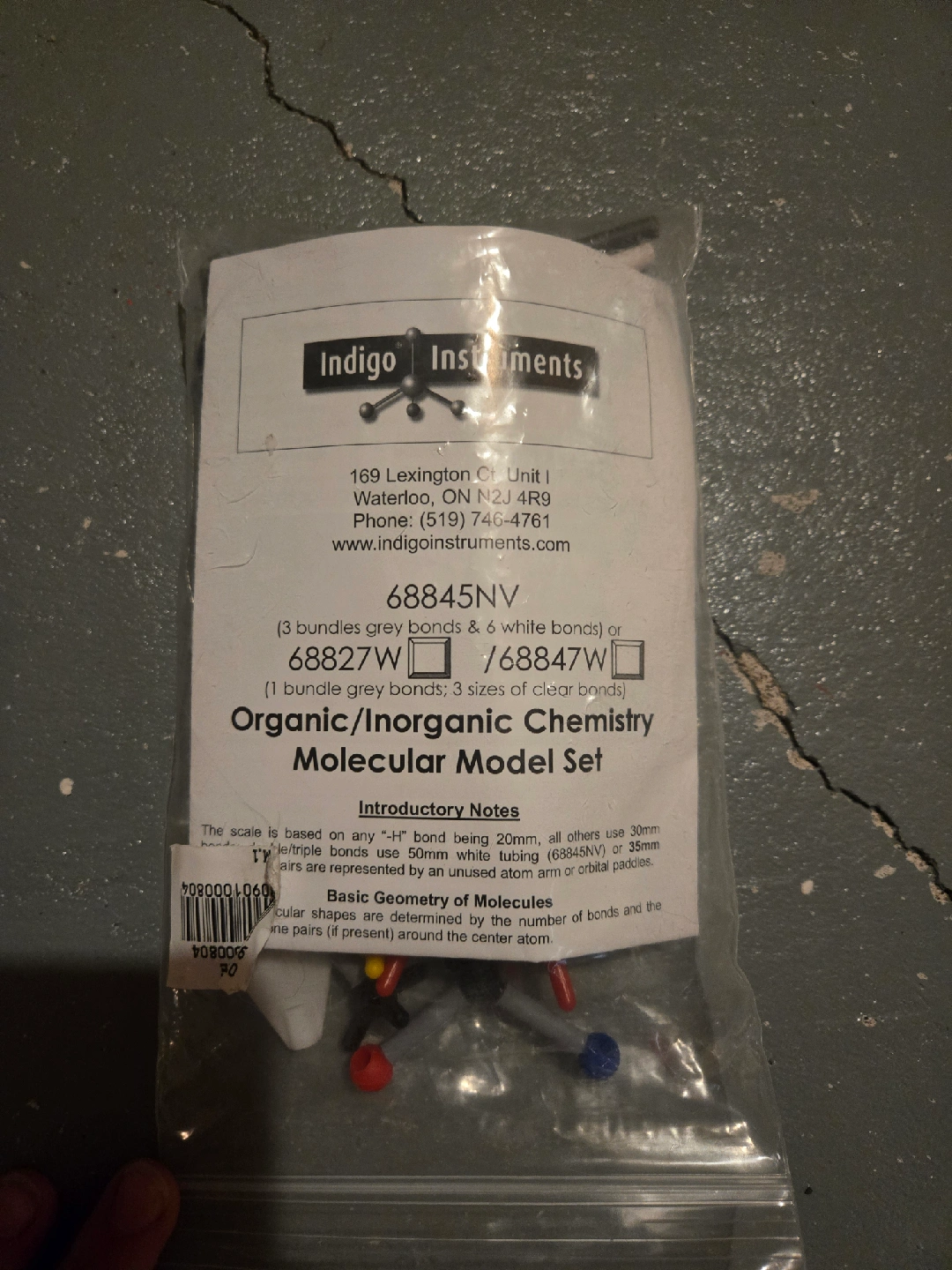 10Selling an Indigo Instruments Organic/Inorganic Chemistry Molecular Model Set! It includes bundles of grey and white bonds, as well as clear bonds in various sizes. Great for learning about basic geometry of molecules