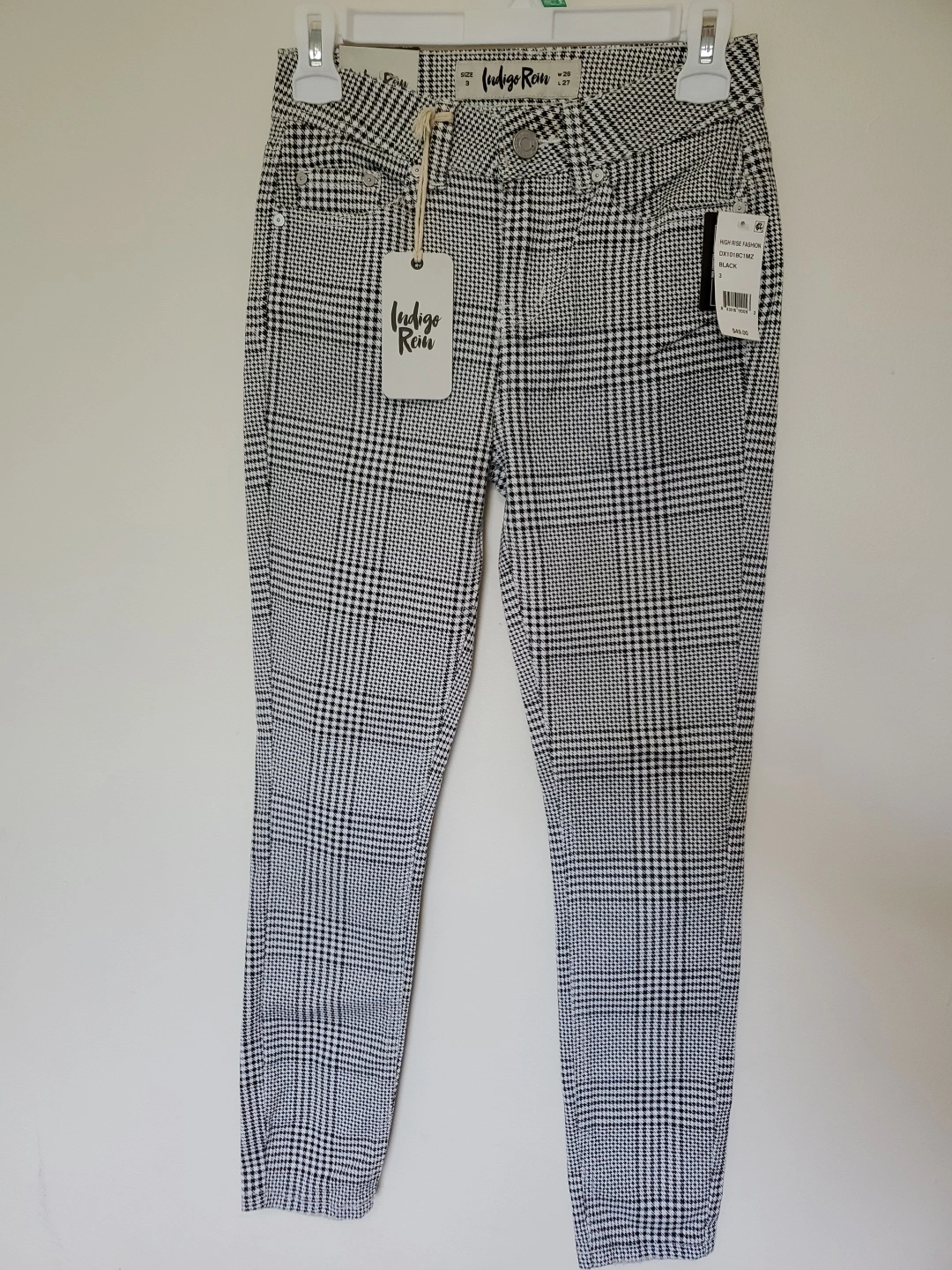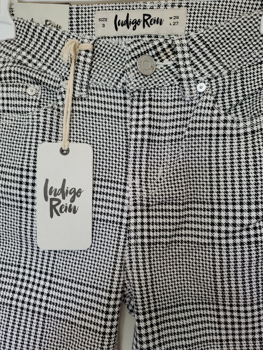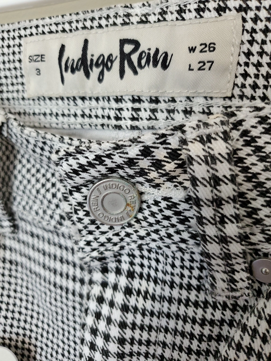 These Indigo Rein pants feature a stylish houndstooth pattern in black and white. They're a high-rise style and size 3. The tag shows W 26 and L 27.