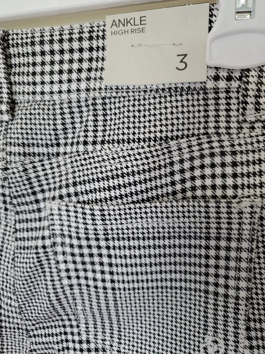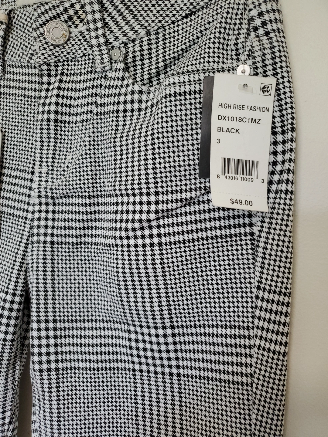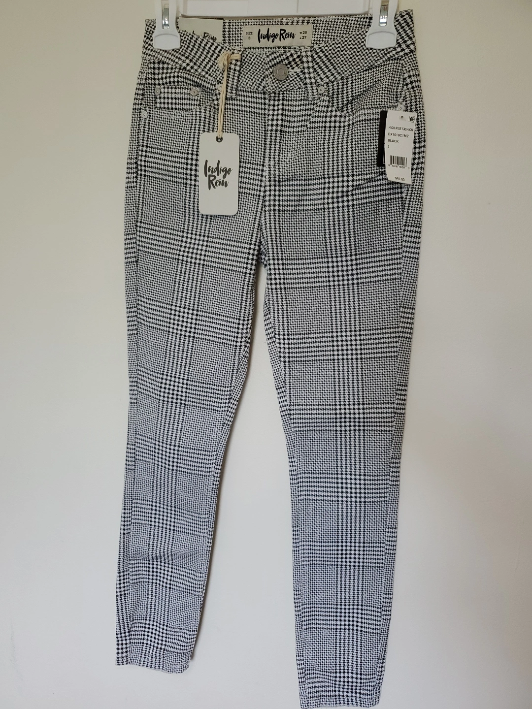 These Indigo Rein pants feature a stylish houndstooth pattern in black and white. They're a high-rise style and size 3. The tag shows W 26 and L 27.
