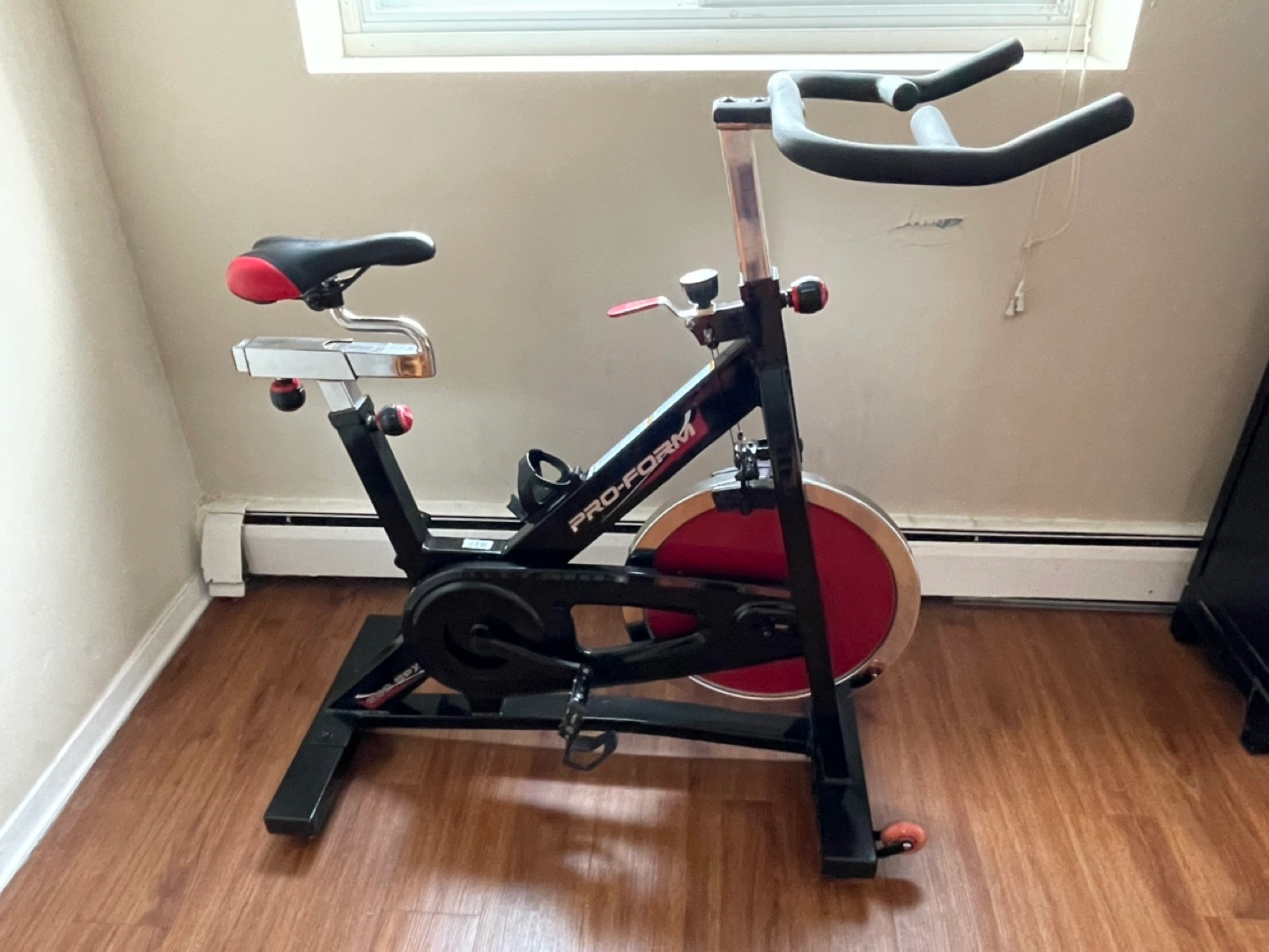 15Indoor cycle exercise bike with adjustable seat and handlebars. Includes a water bottle holder and wheels for easy movement. Good condition.