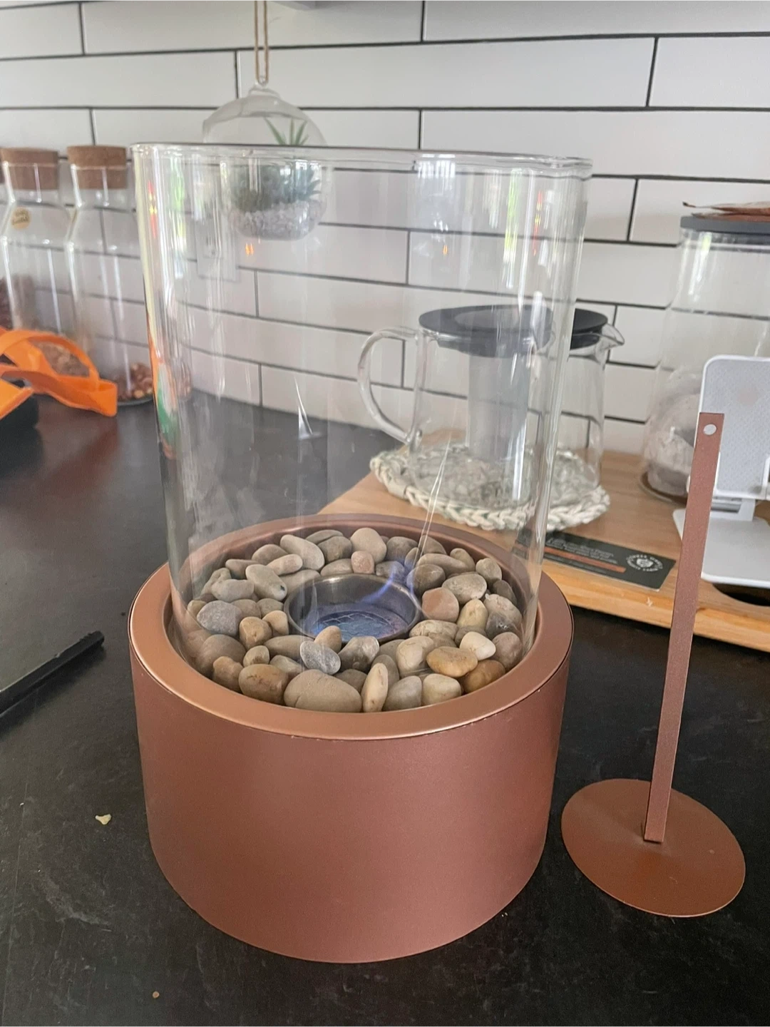 Add a touch of warmth and ambiance to your space. It features a sleek, modern design with a copper-coloured base, clear glass surround, and natural river rocks. Perfect for creating a cozy atmosphere in any room of your home.
