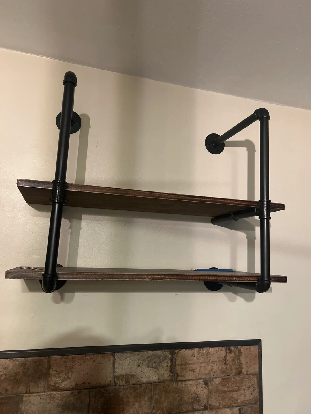 111Selling a cool industrial-style wall shelf! It's made with black pipes and wooden shelves. The shelf is about 31 inches long and 11 inches deep. It's a great way to add some rustic charm to your space