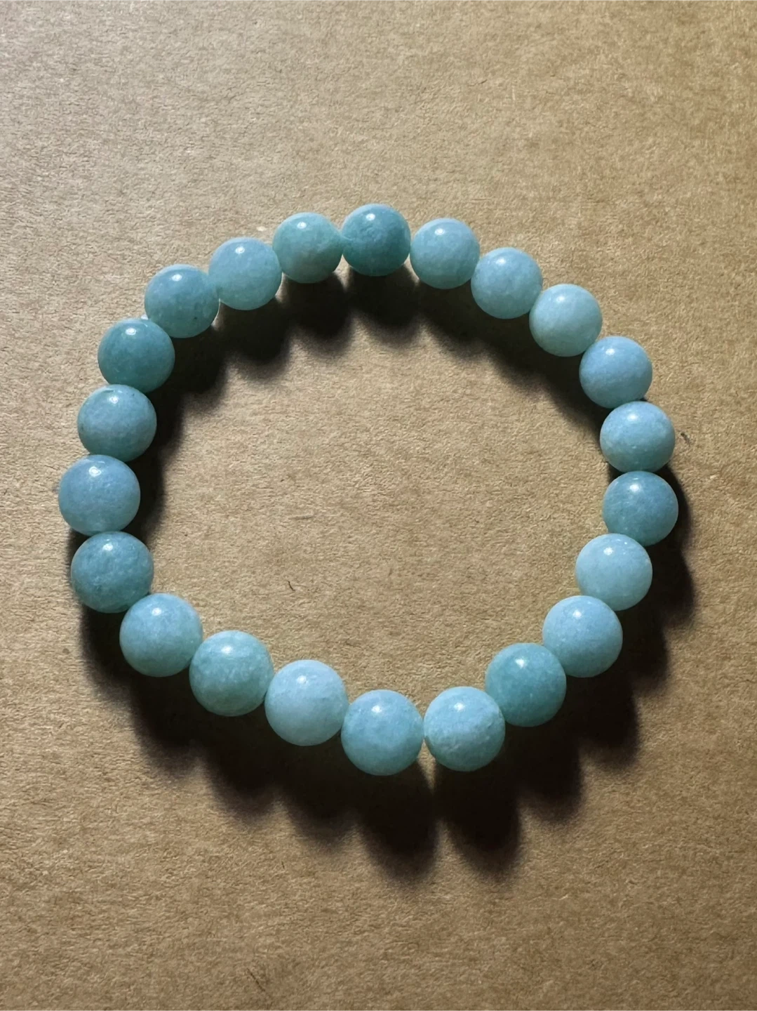 A stretchy bracelet featuring light blue aquamarine beads. It's strung on elastic cord. This bracelet adds a subtle pop of colour to any outfit!